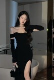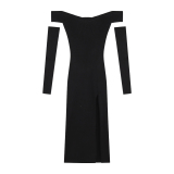Черное трикотажное платье, нарукавники, базовая весенняя длинная юбка, открытые плечи, средней длины, тренд сезона, городской стиль, яркий броский стиль