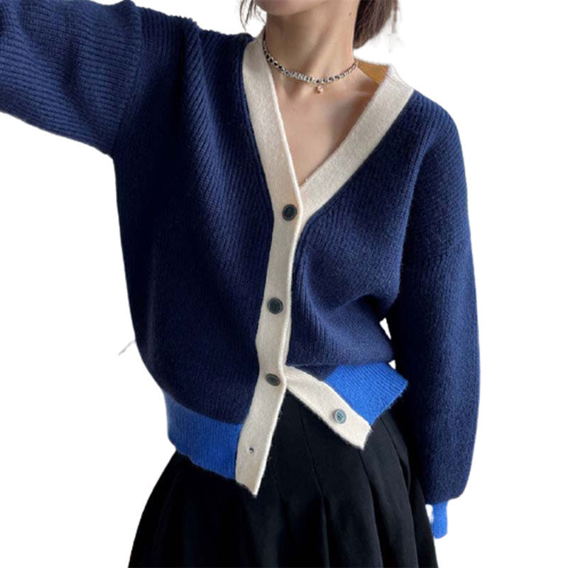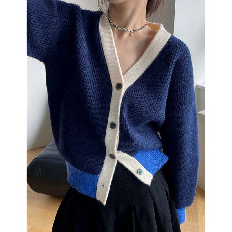 Бархатный синий трикотажный кашемировый свитер, осенний кардиган, изысканный стиль, V-образный вырез