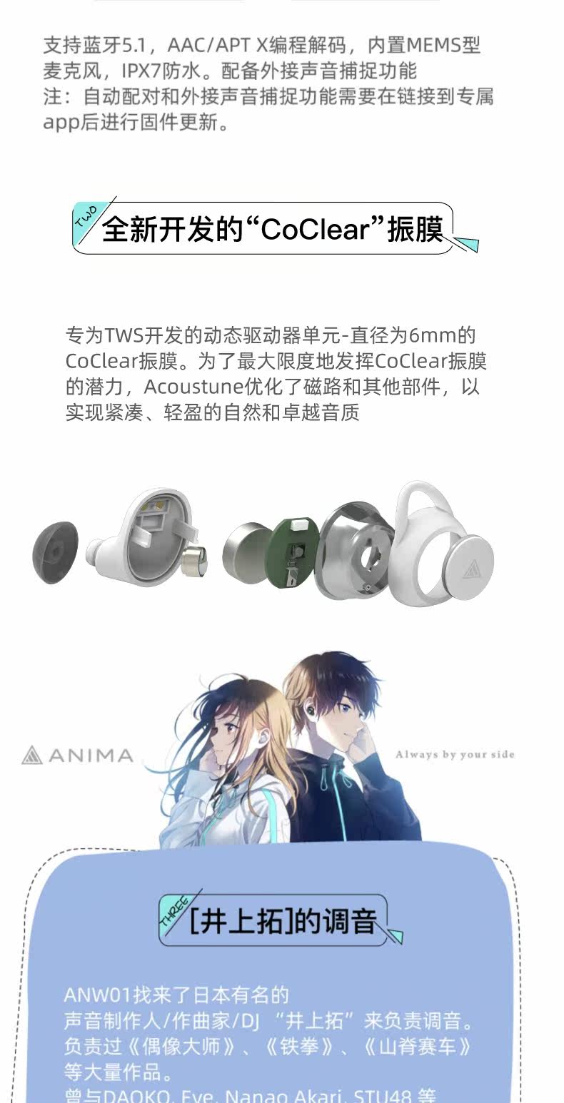 Acoustune anima anw01 TWS True Wireless Bluetooth Раннее интеллектуальное звук старший голос Bluetooth 5.1 Ipx7 Водонепроницаемые наушники Hifi Hifi Hifi