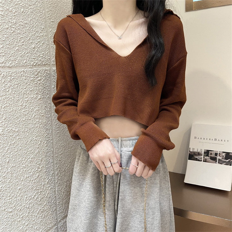 Трикотажный короткий брендовый весенний лонгслив, V-образный вырез, высокая талия