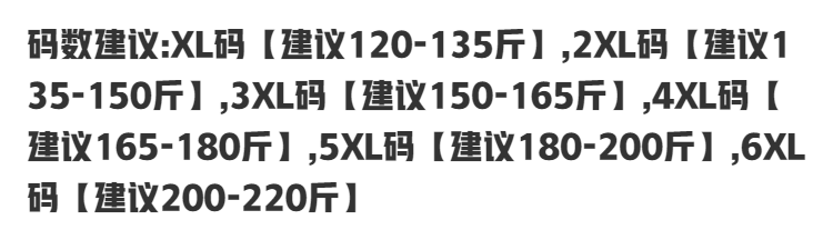 | Размер: | Xl рекомендуется 120-135 кот, 2xl Предложение 135-150 Catties, 3xl Предложение 150-165 Catties, 4xl Предложение 165-180 Catties, 5xl предложение 180-200 кот, 6xl предложить 200-220 кот |