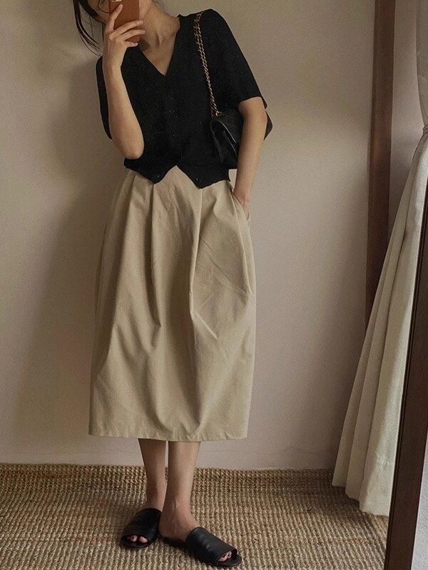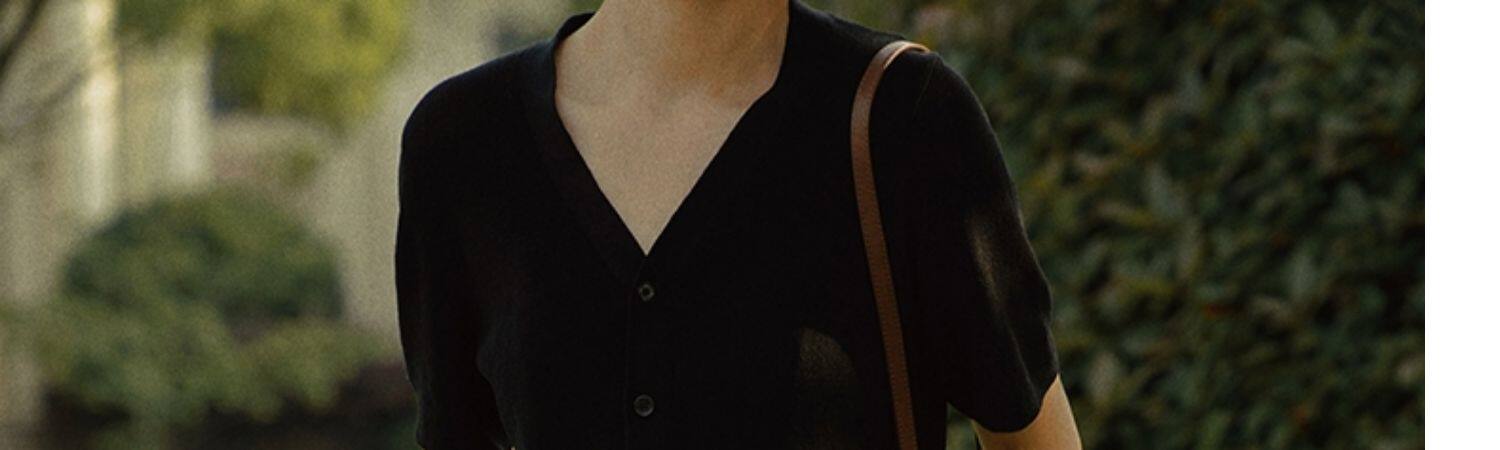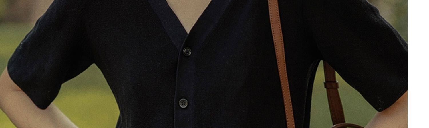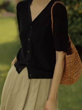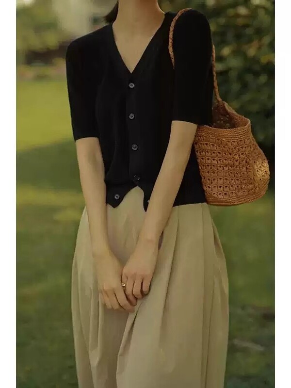 Черная шелковая футболка, летний тонкий кардиган, трикотажный короткий дизайнерский свитер, французский стиль, V-образный вырез