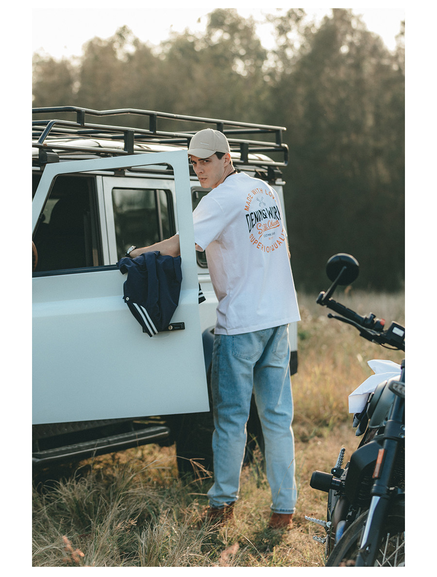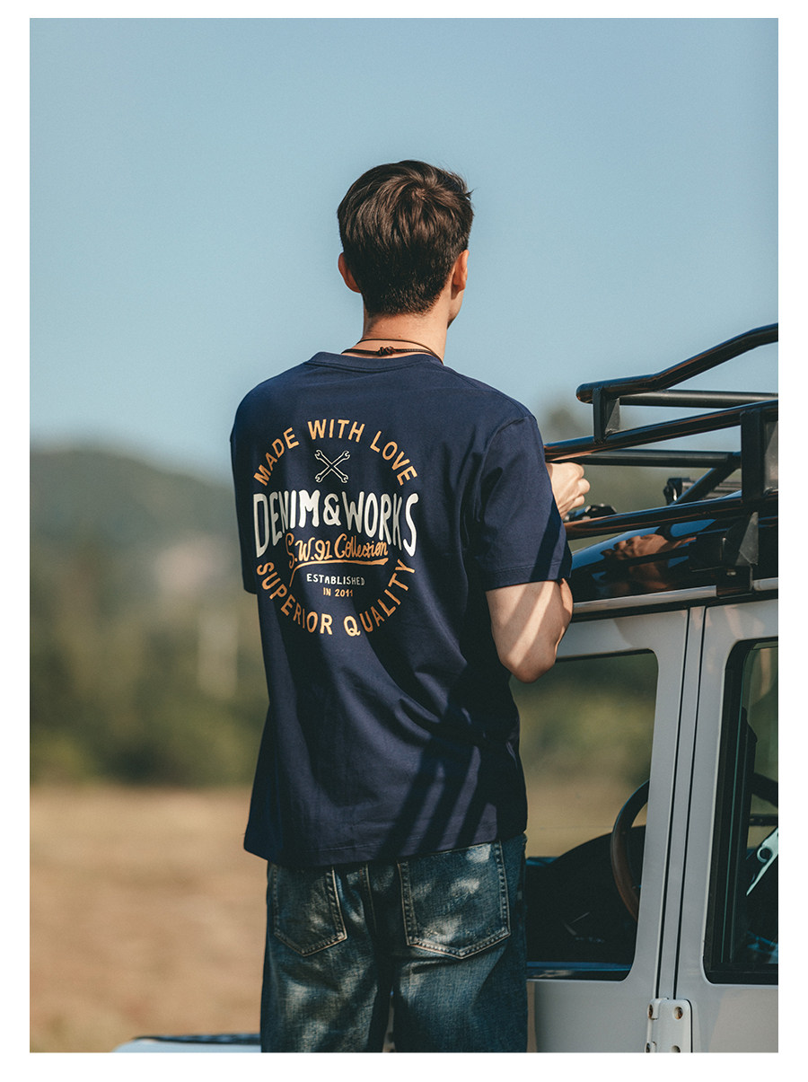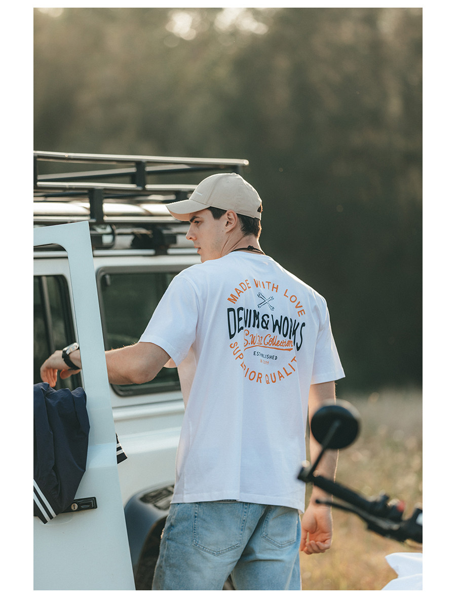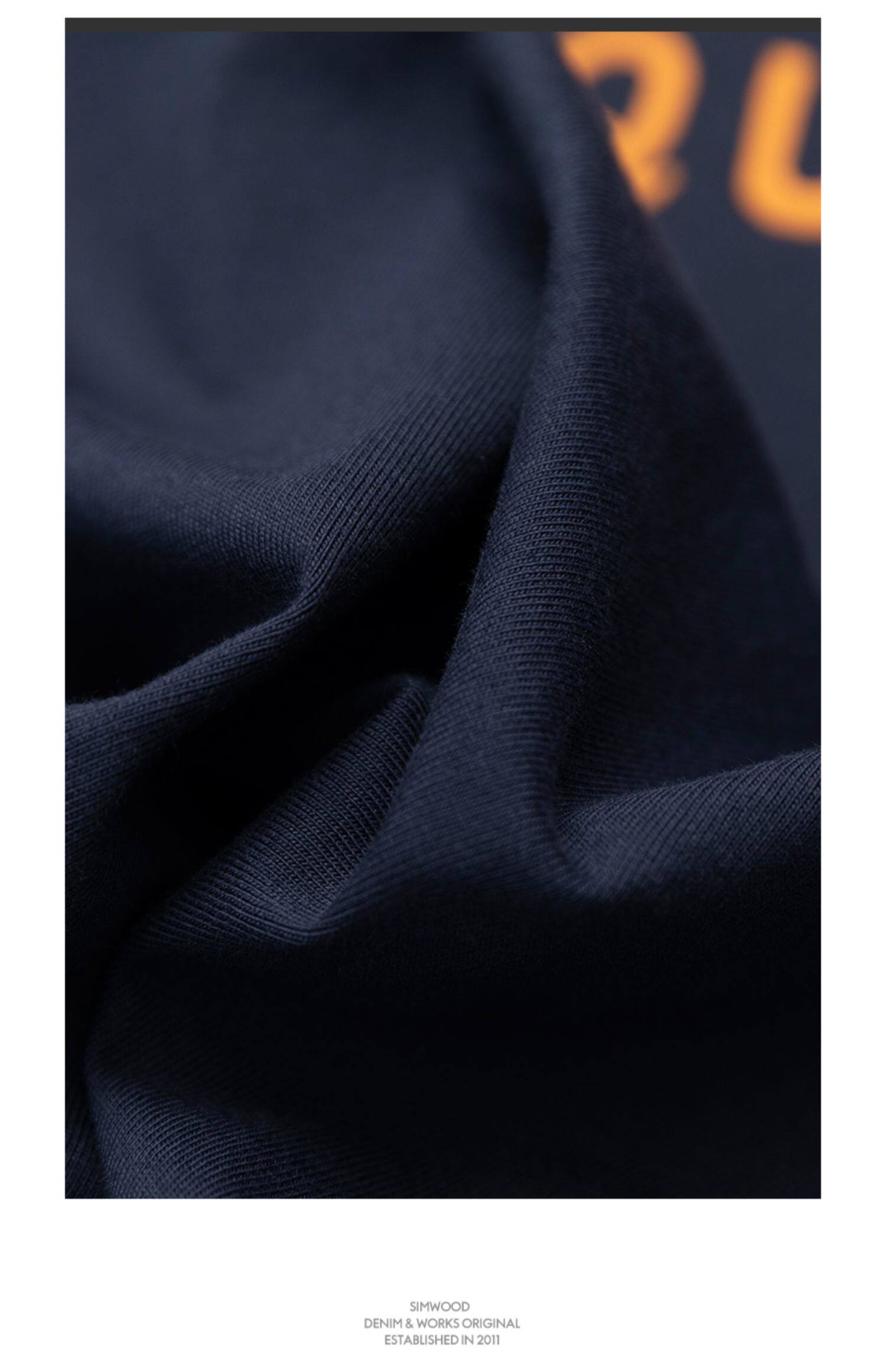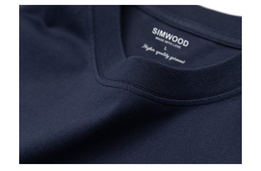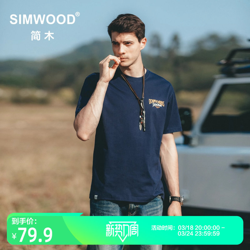 Simwood Простая деревянная мужская одежда [Стандартный свободный] Летний новый продукт 240 г Тяжелая футболка с круглым вырезом и коротким рукавом с принтом сзади