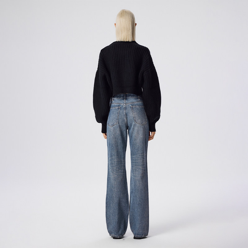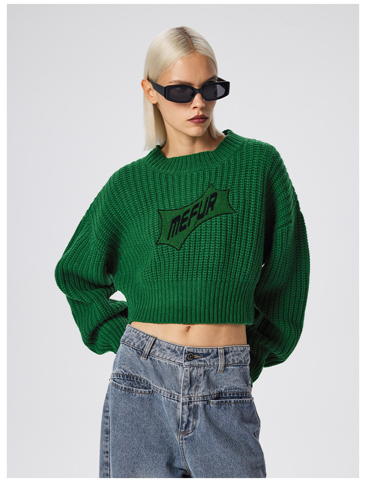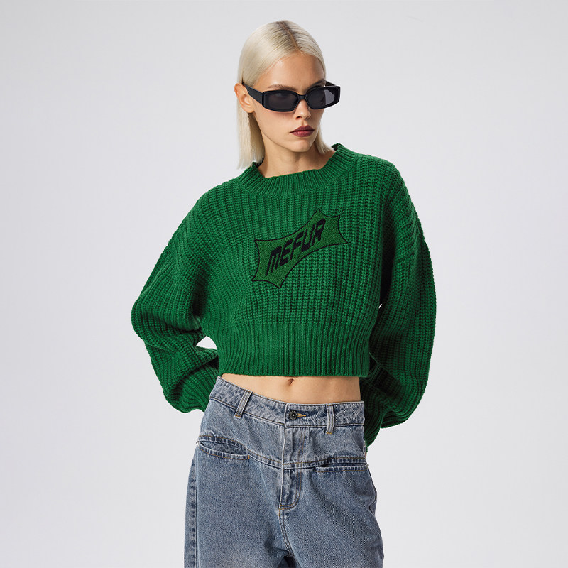 Трикотажный короткий зеленый шерстяной зимний свитер с круглым воротником