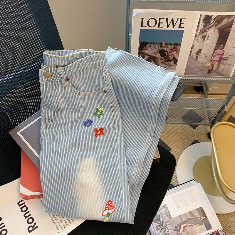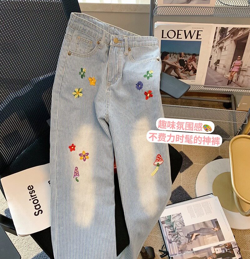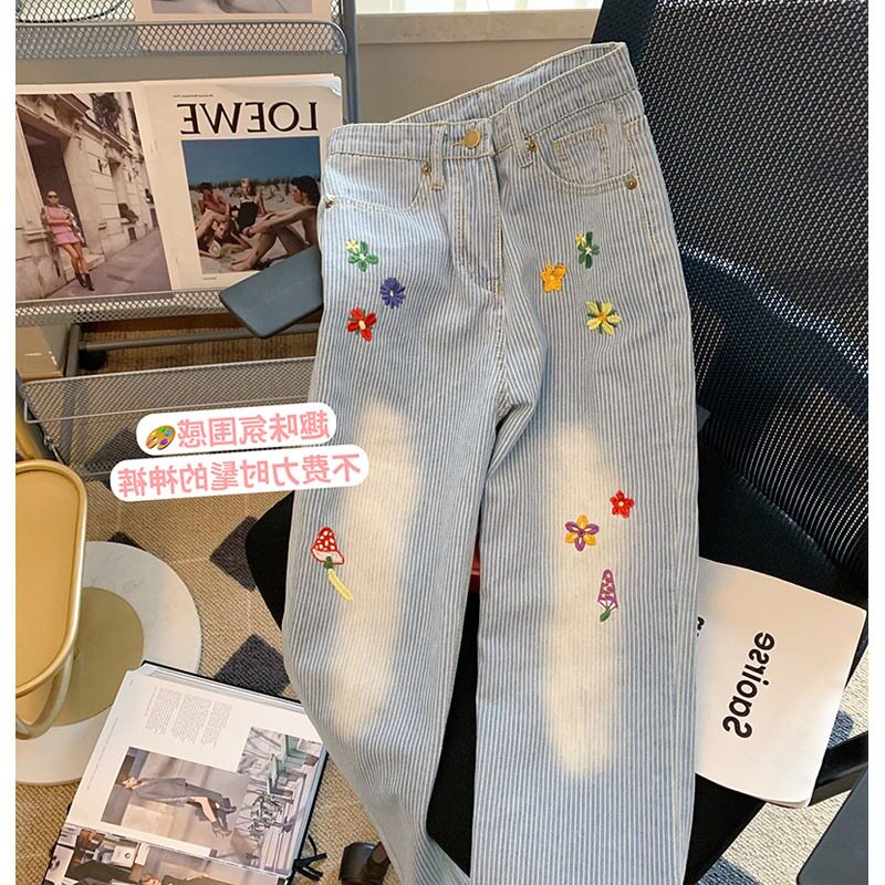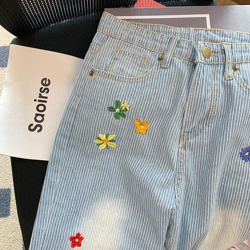 Дизайнерские весенние джинсы, штаны, синие повседневные брюки, тренд сезона, с вышивкой, в цветочек