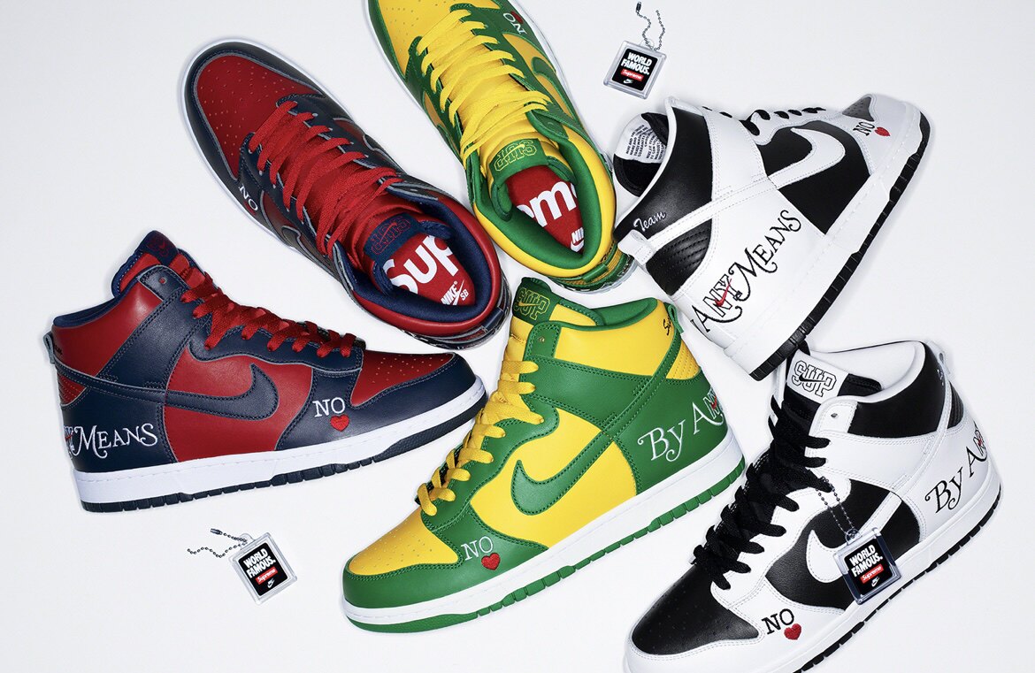 Соединение Supreme x Nike SB Dunk High черно-белое красно-синее желто-зеленое DN3741-002