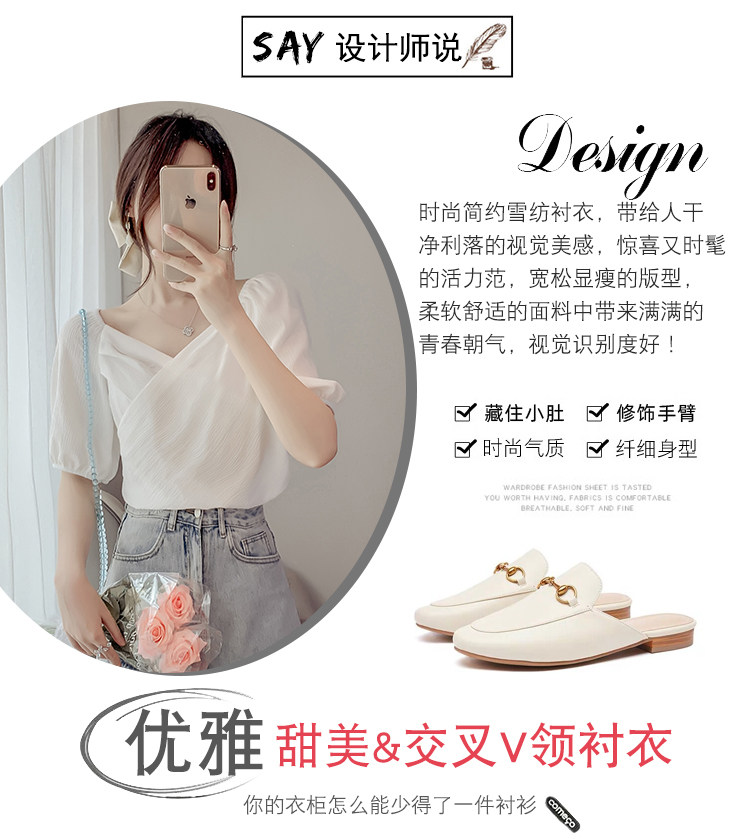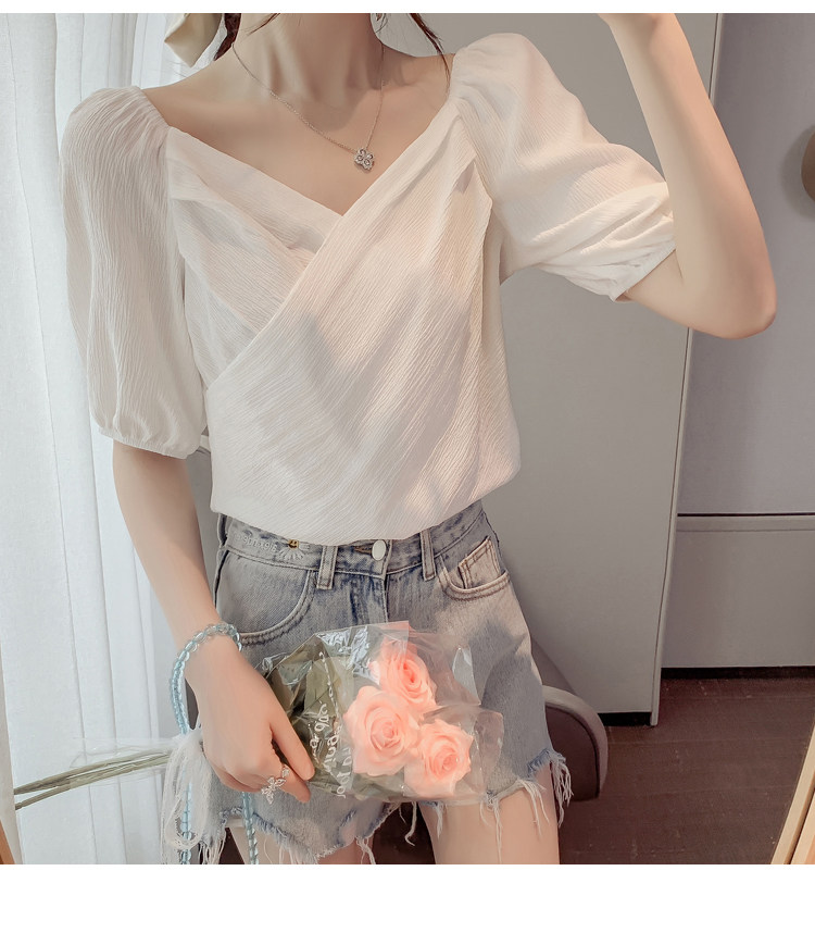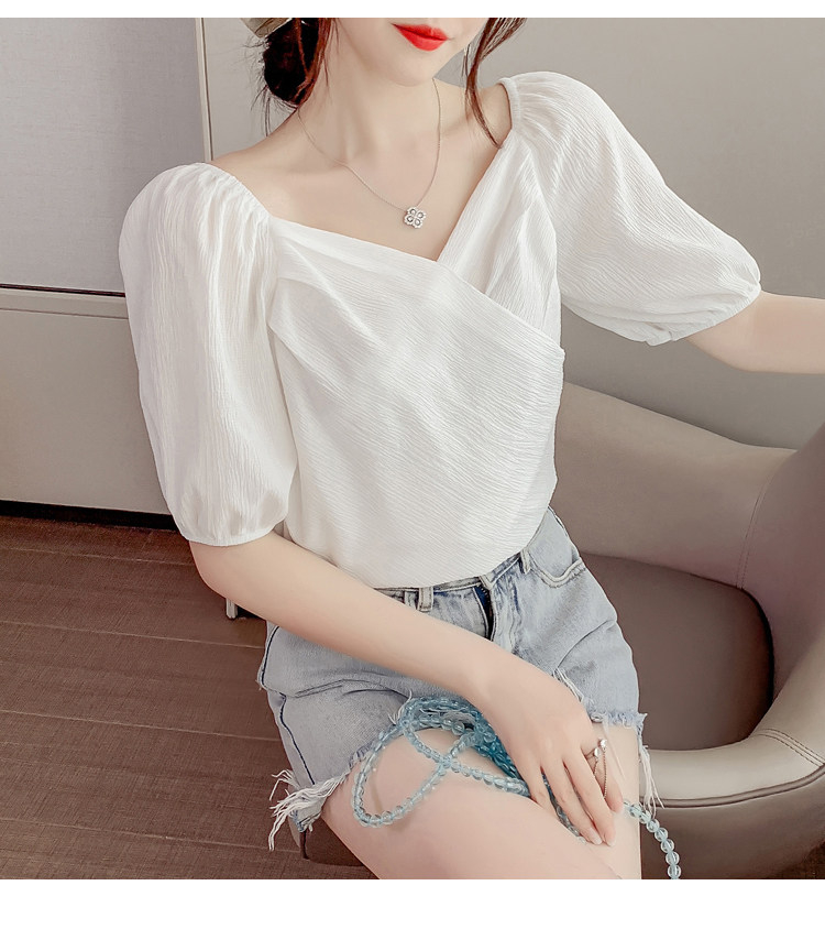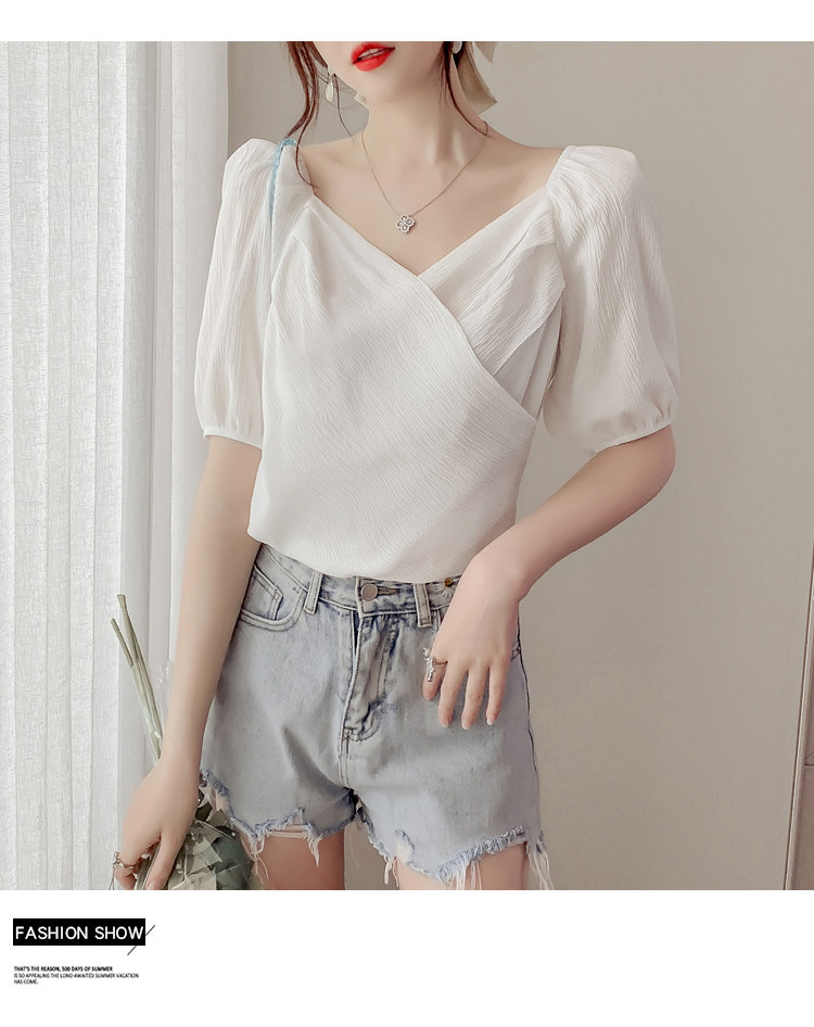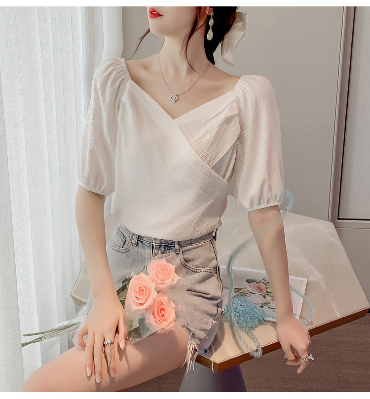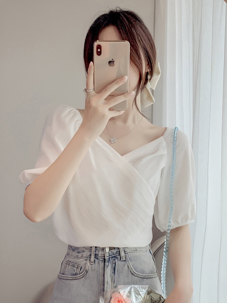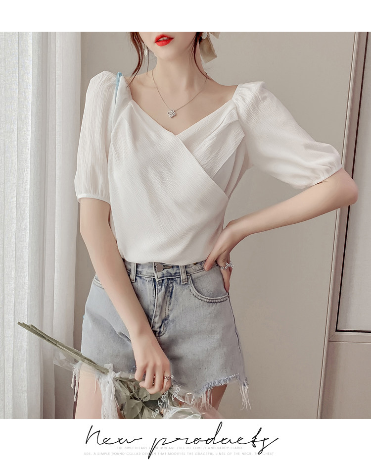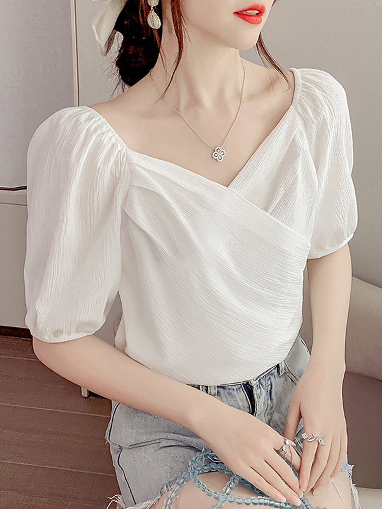 Белая рубашка, дизайнерская летняя одежда, футболка с коротким рукавом, тренд сезона, V-образный вырез, французский стиль, в западном стиле