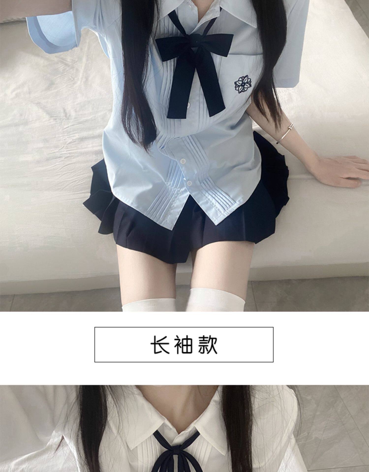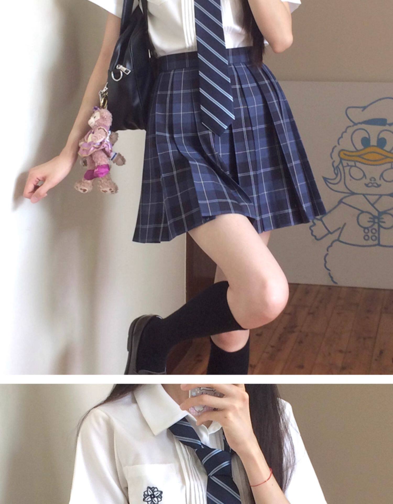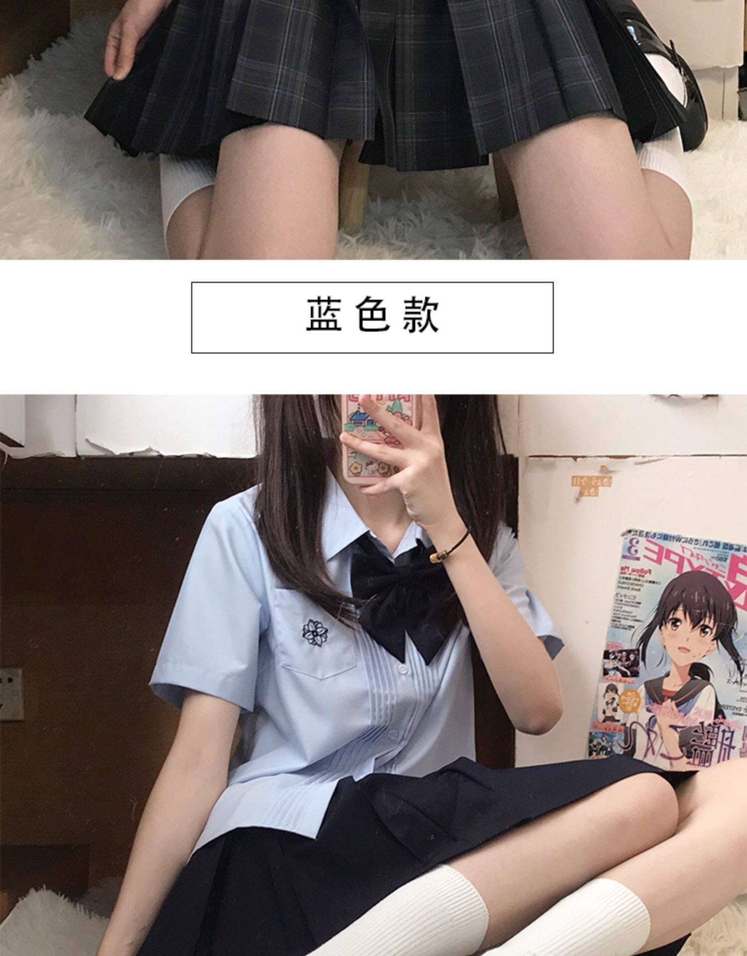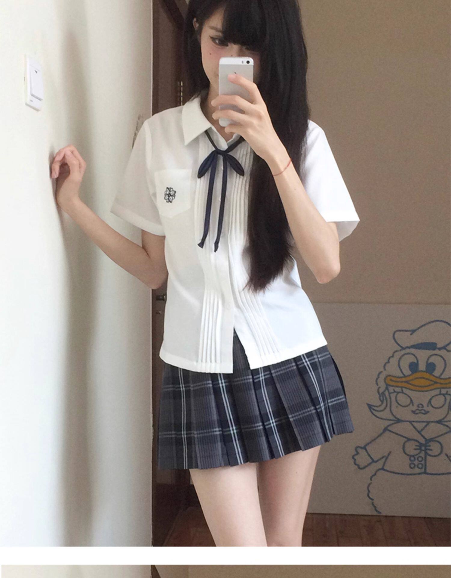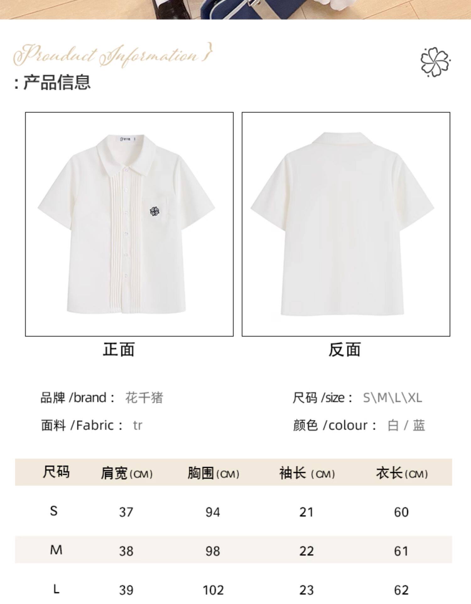 花千猪 Оригинальная рубашка, белый синий лонгслив, студенческая юбка в складку, короткий рукав, с вышивкой