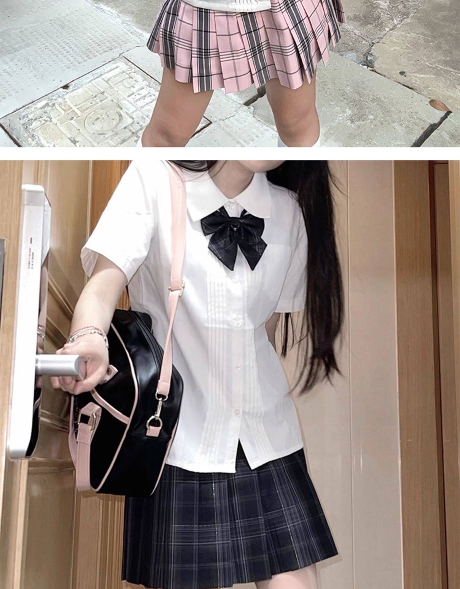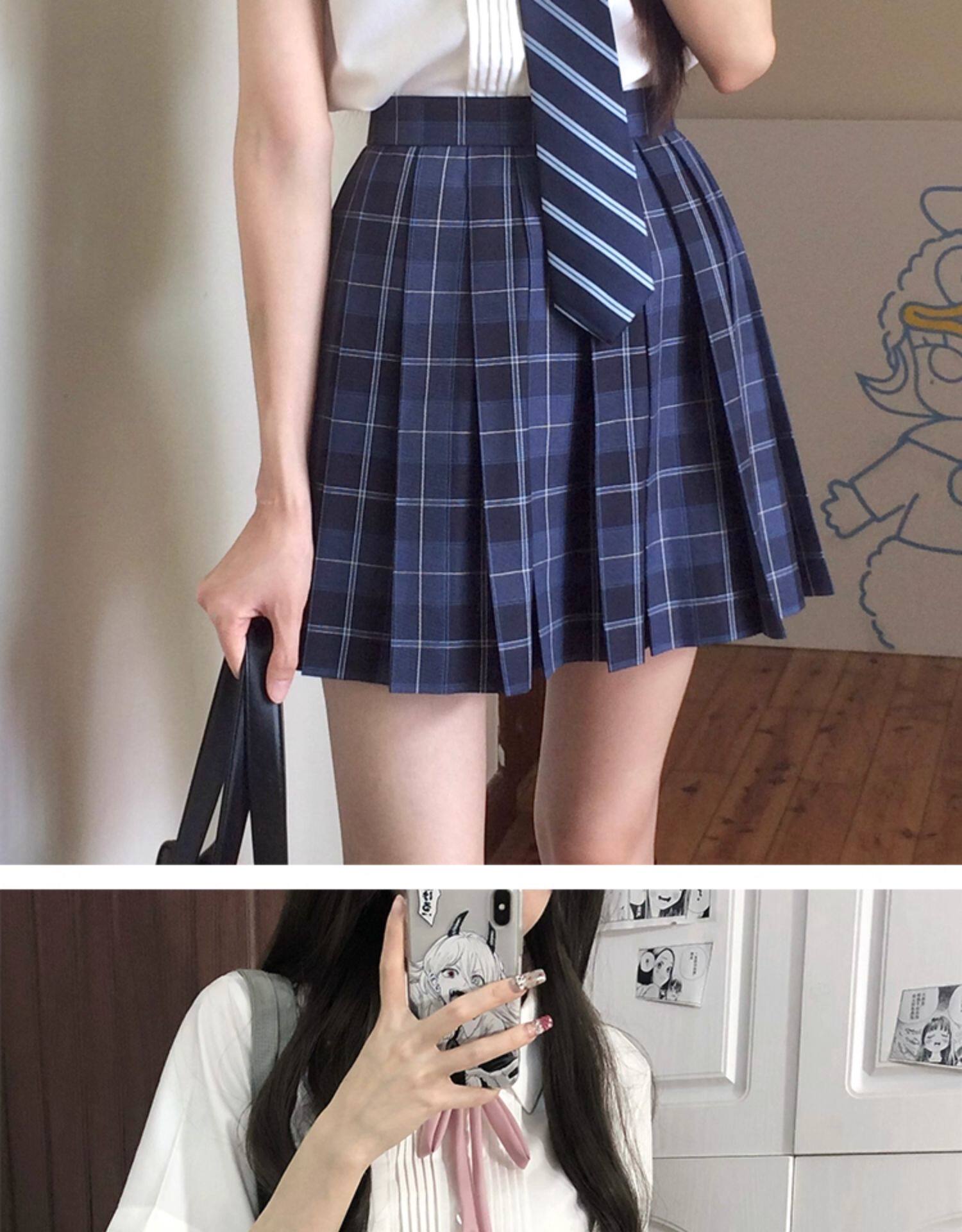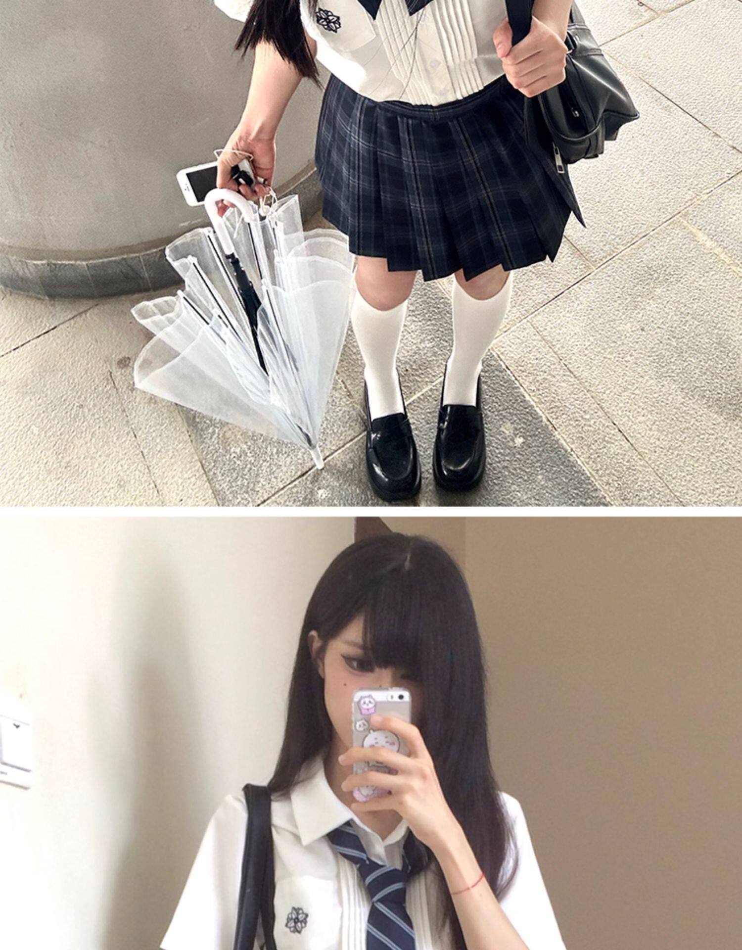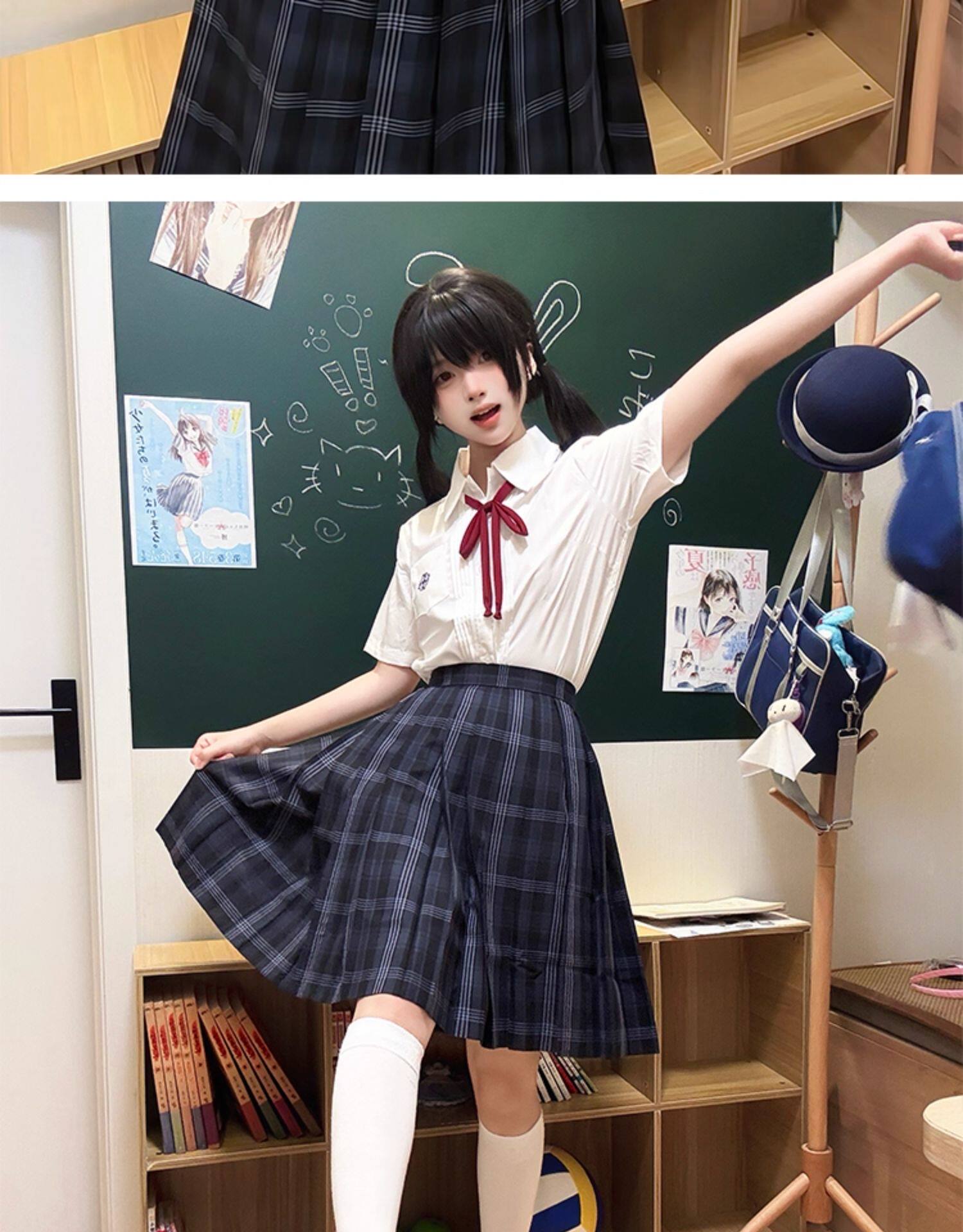 花千猪 Оригинальная рубашка, белый синий лонгслив, студенческая юбка в складку, короткий рукав, с вышивкой