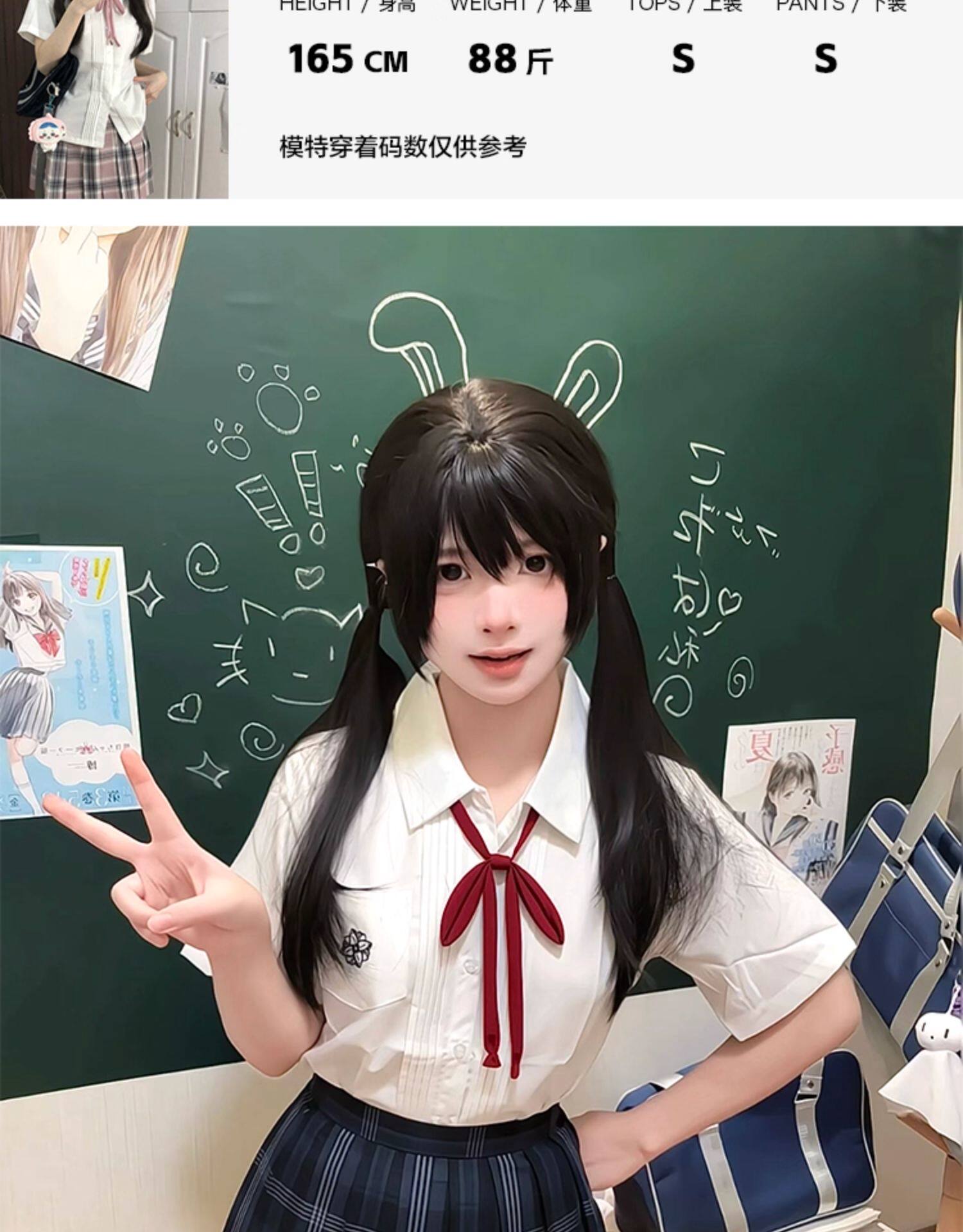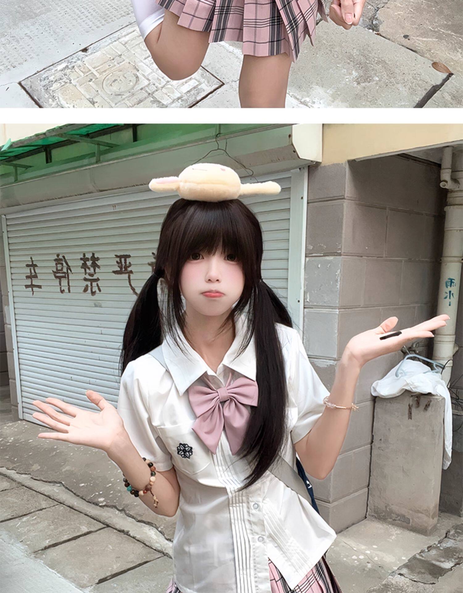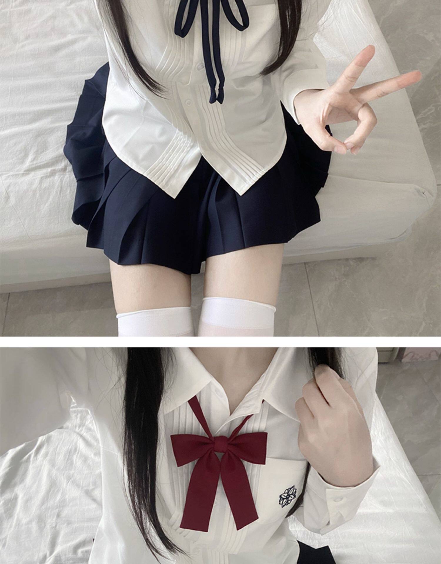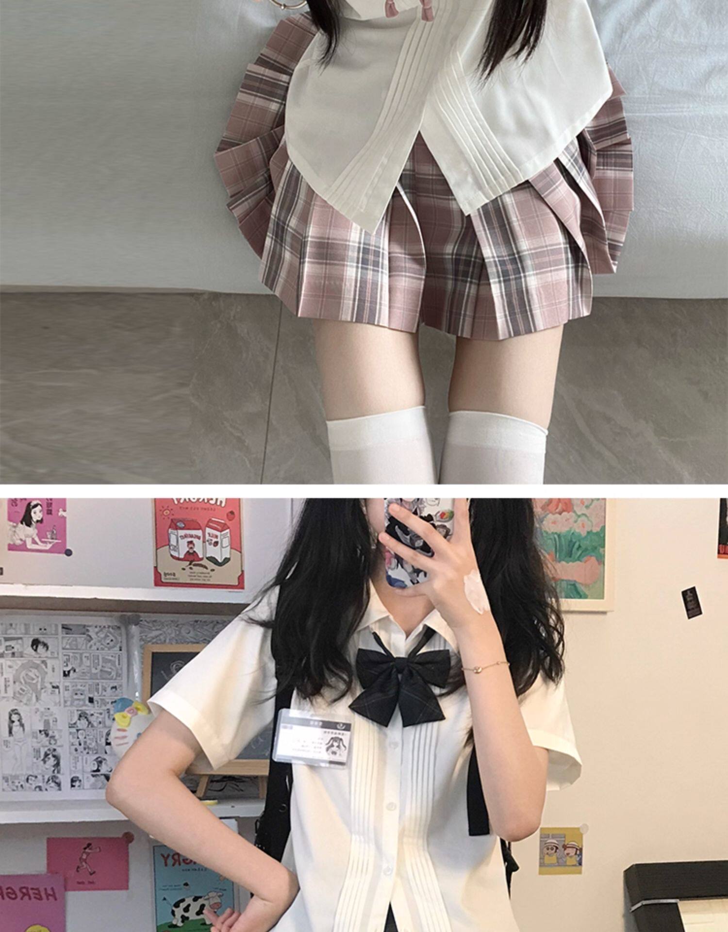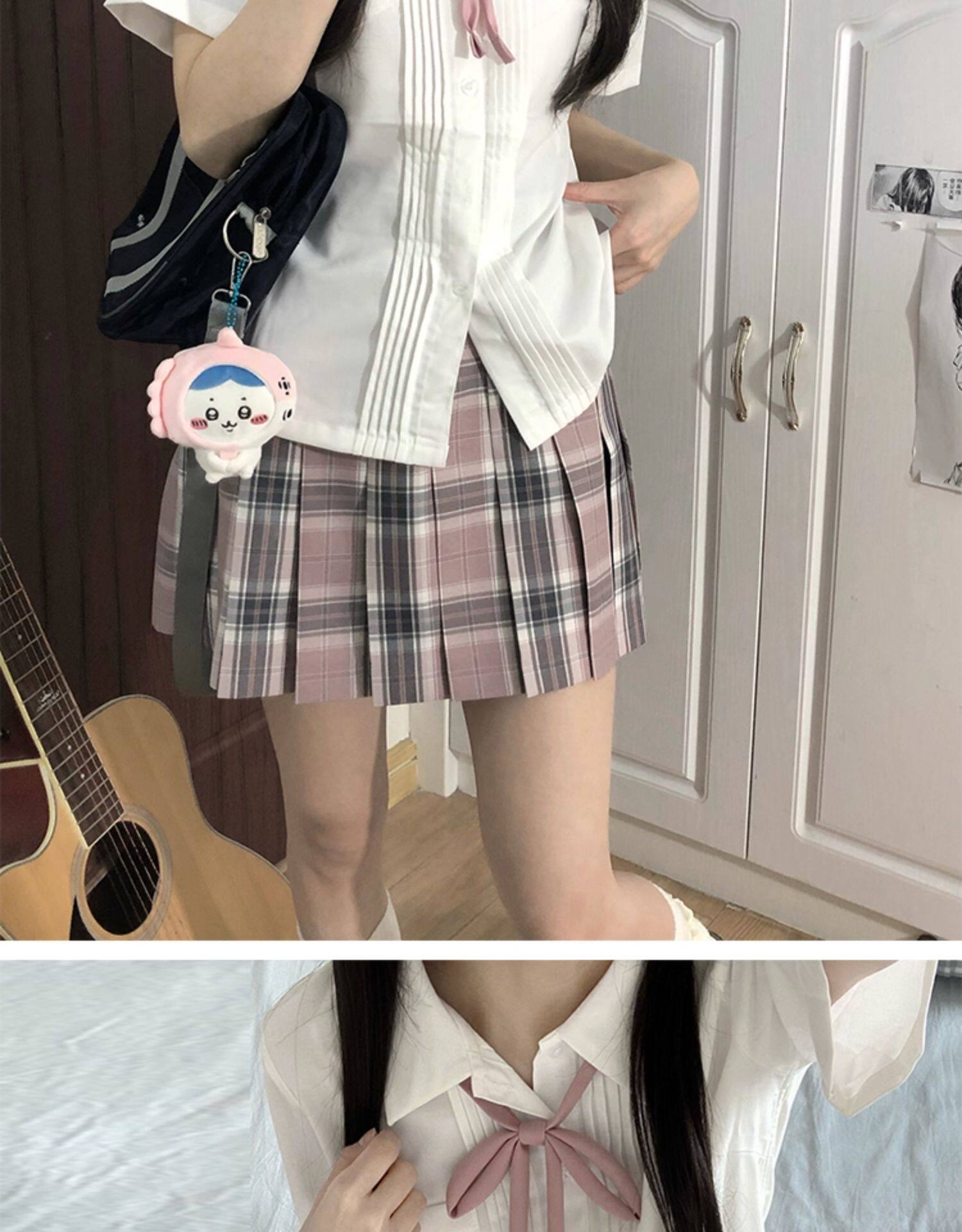 花千猪 Оригинальная рубашка, белый синий лонгслив, студенческая юбка в складку, короткий рукав, с вышивкой