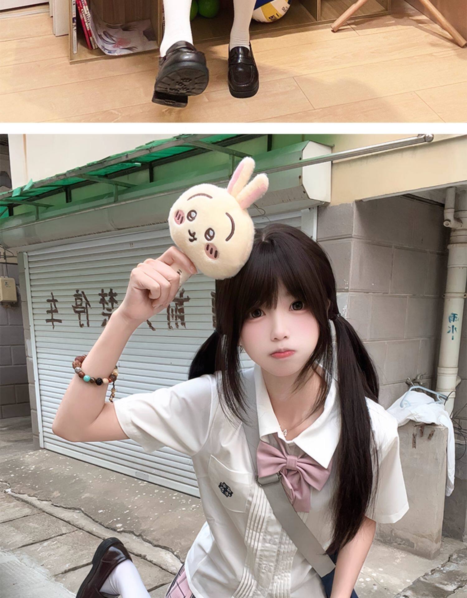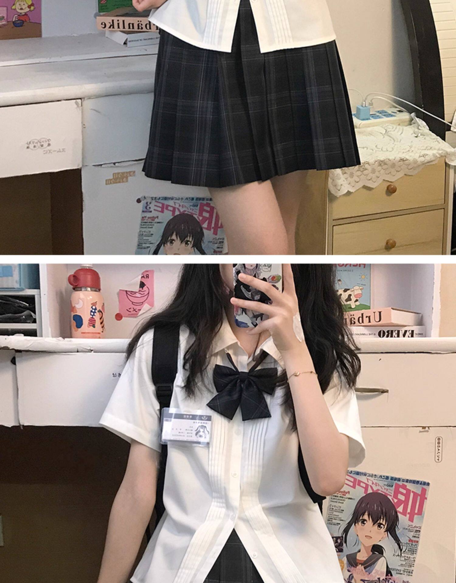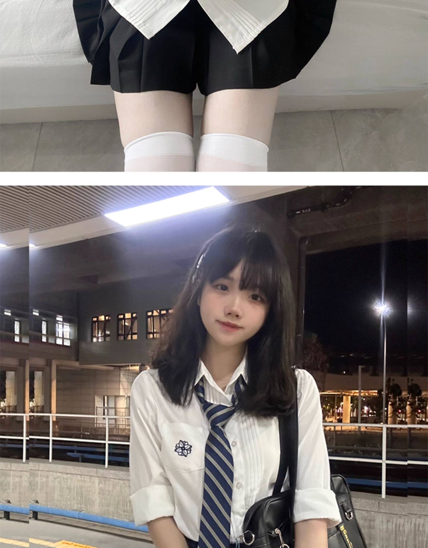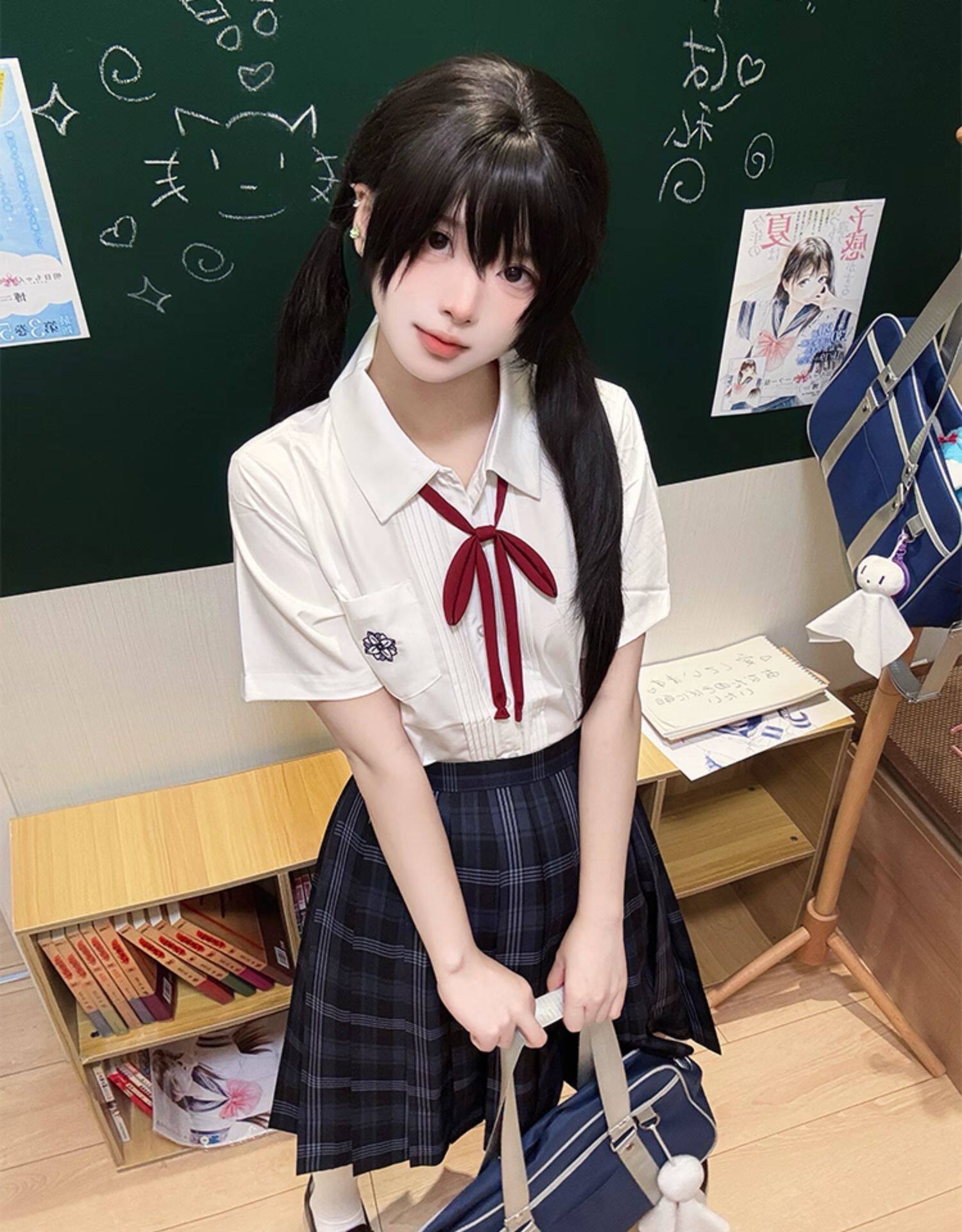 花千猪 Оригинальная рубашка, белый синий лонгслив, студенческая юбка в складку, короткий рукав, с вышивкой