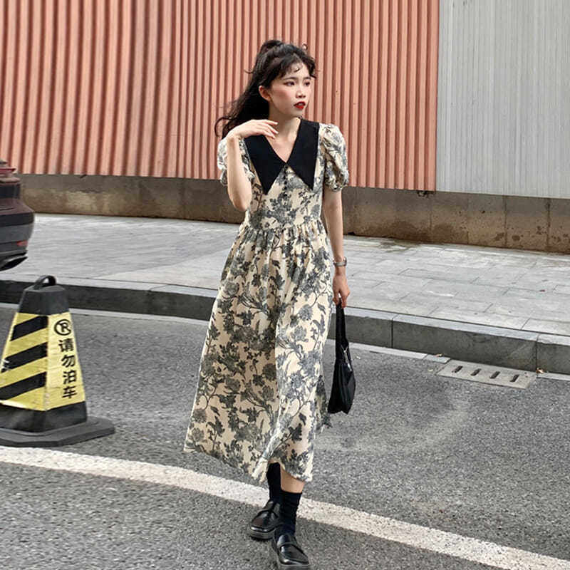 Ретро платье, военно-морская длинная юбка, коллекция 2022, французский стиль, в цветочек, длина макси