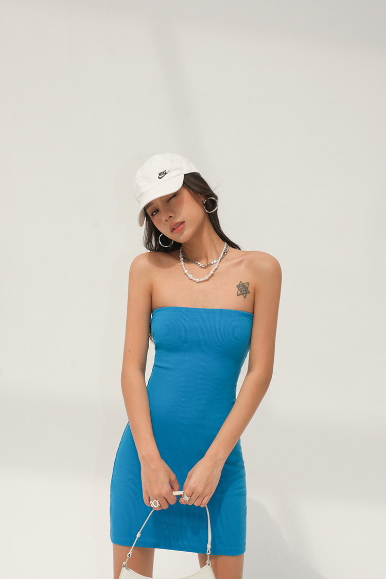 Синий бюстгальтер-топ, летнее платье, европейский стиль, в обтяжку, с акцентом на бедрах