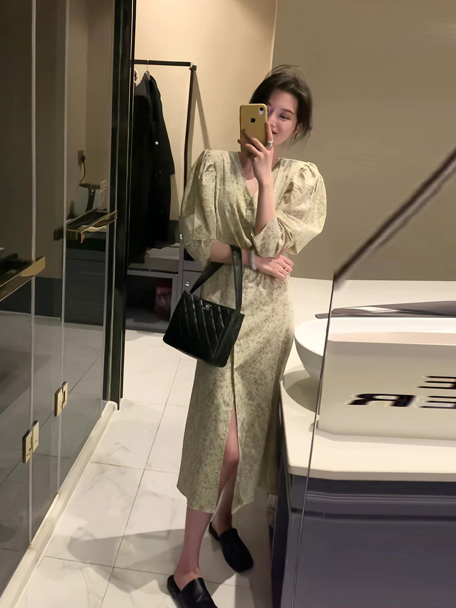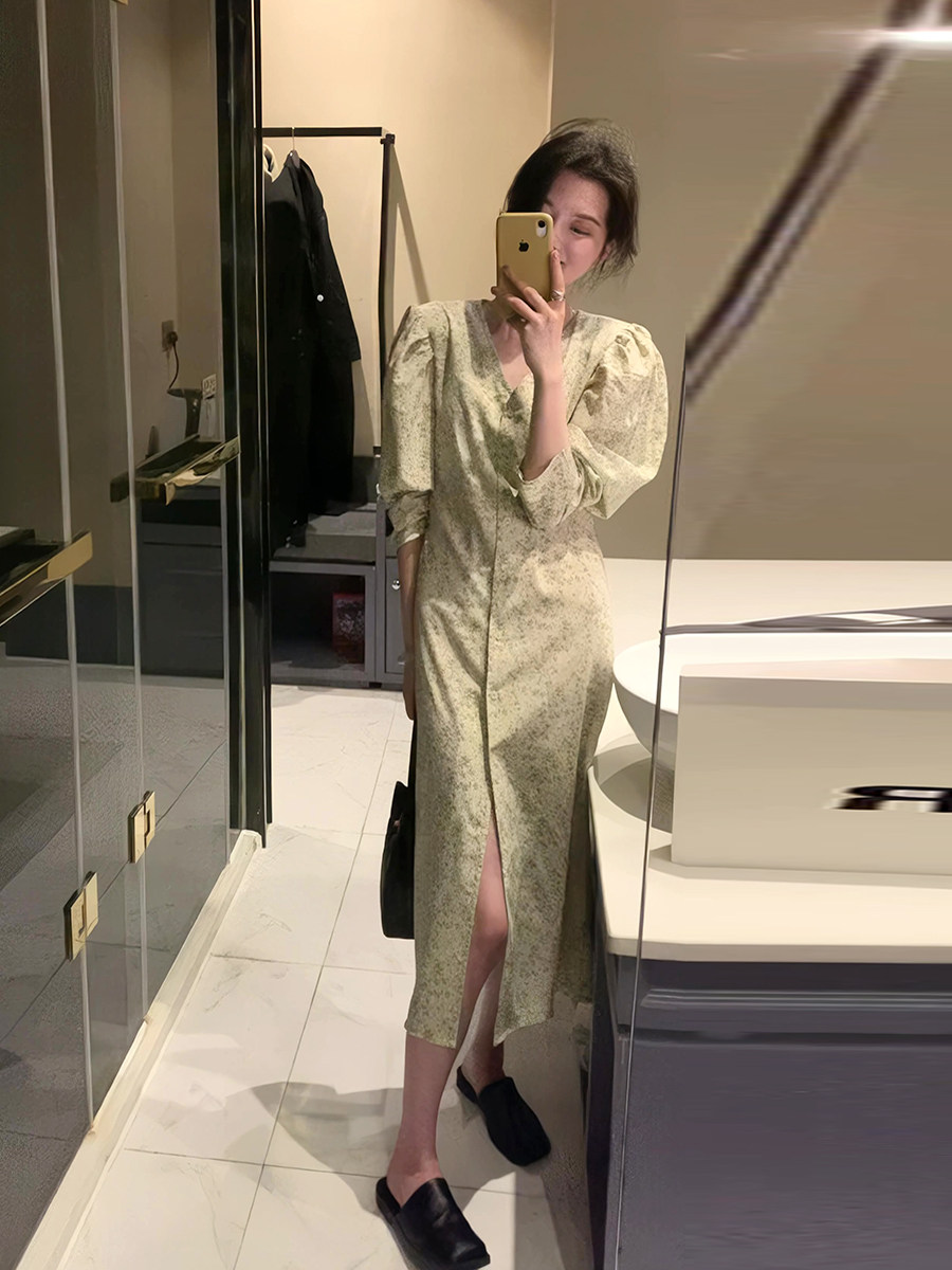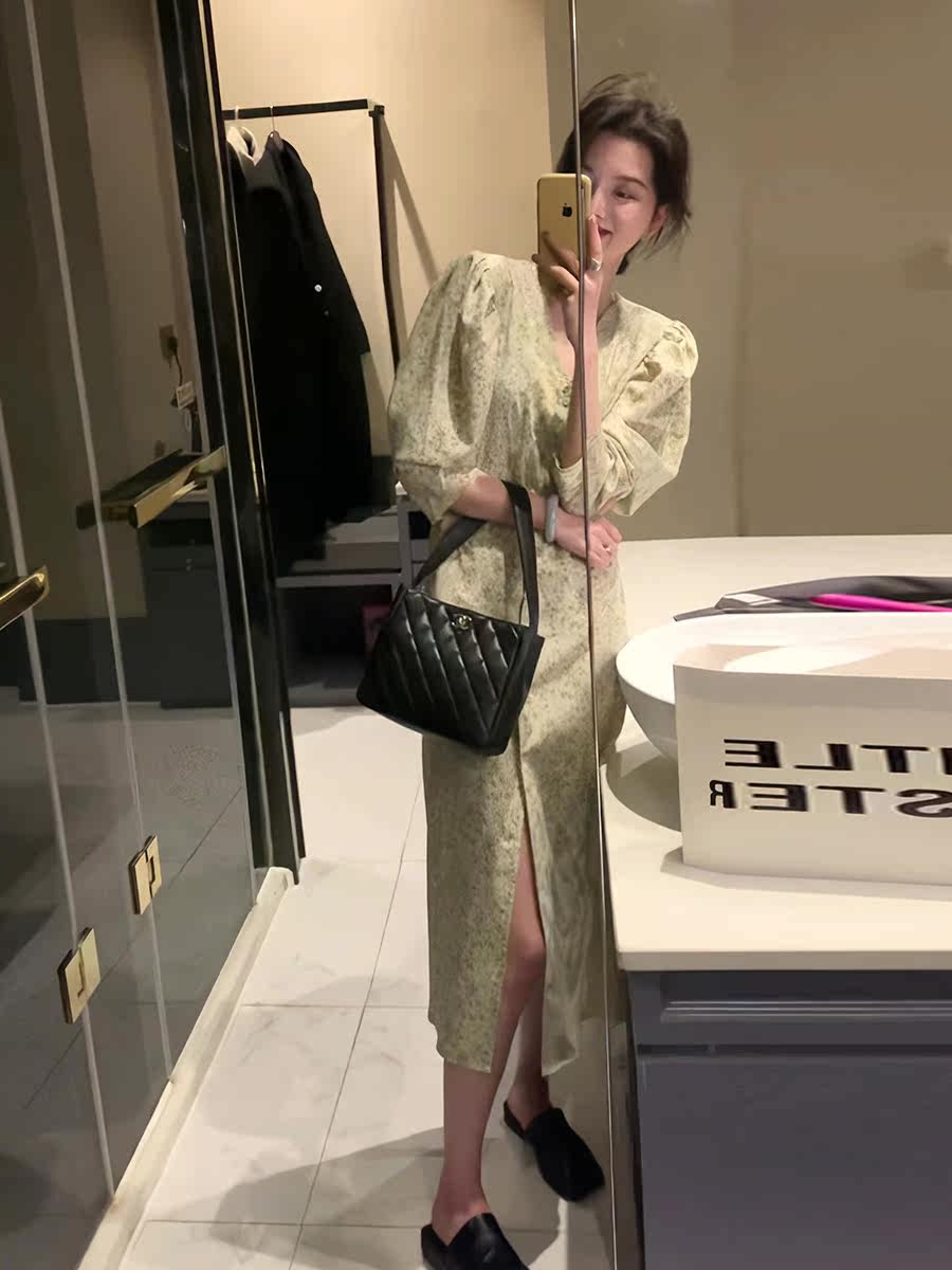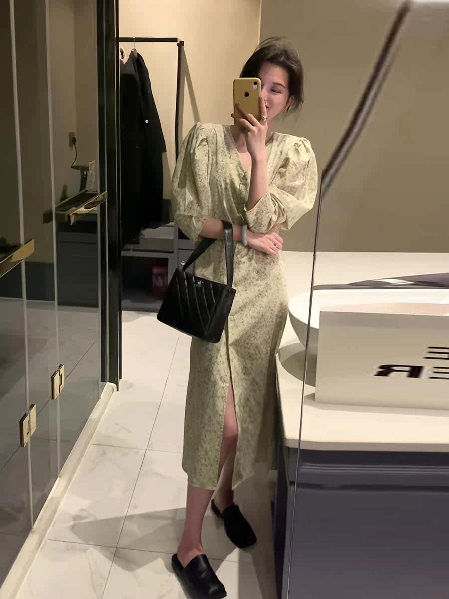 Весеннее осеннее платье, ретро элитный лонгслив, длинная юбка, французский стиль, цветочный принт, V-образный вырез, в корейском стиле