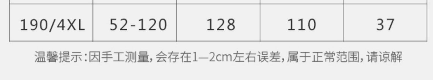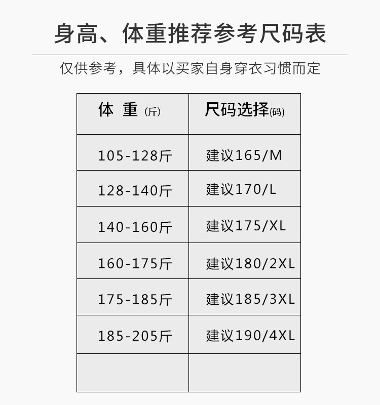 | Размер: | 165/м [105-125 Catties], 170/л 【125-145 Catties】, 175/xl 【145-158 Catties】, 180/2xl 【160-170 Catties】, 185/3xl 【170-185 Catties】, 190/4xl 【185-205 Catties】 |