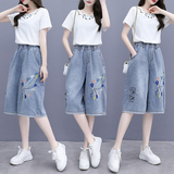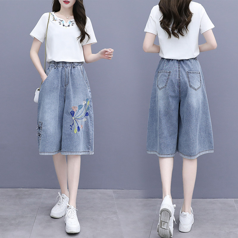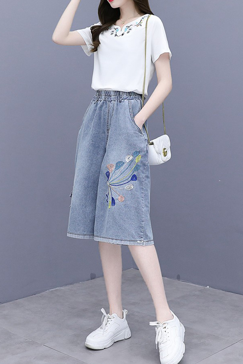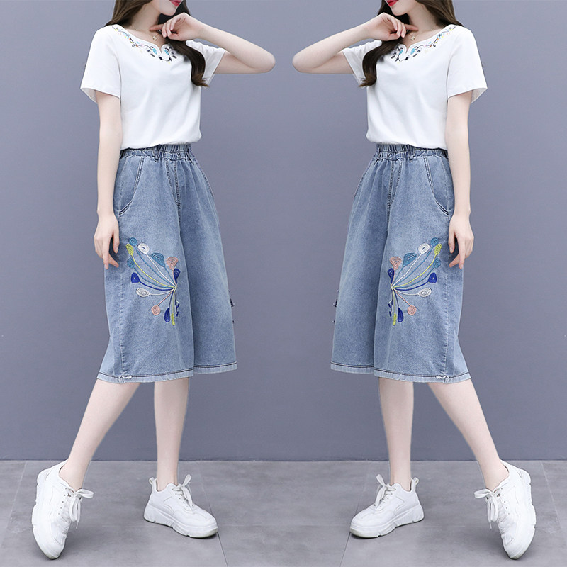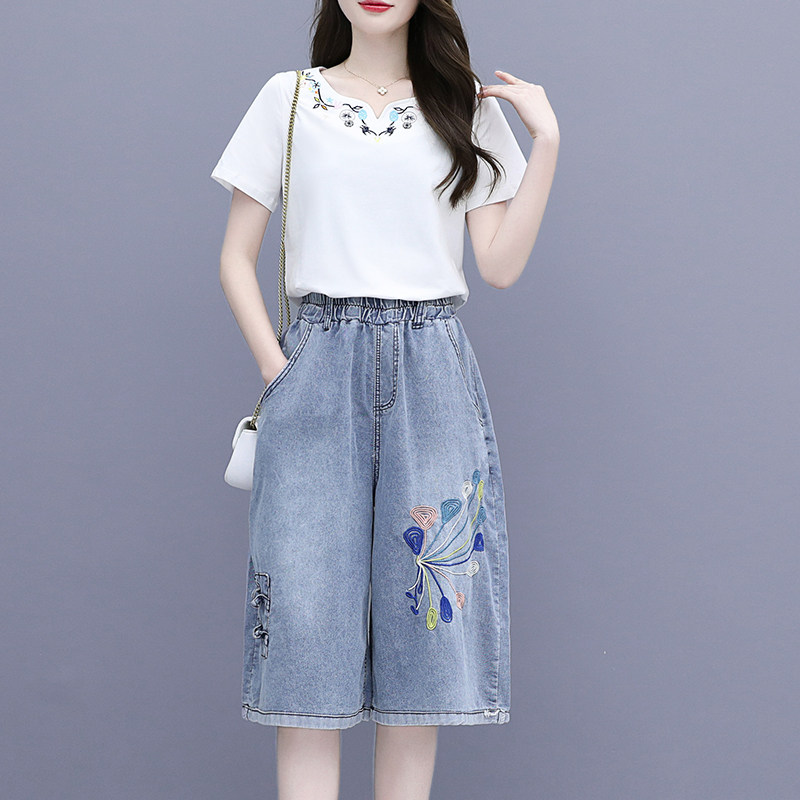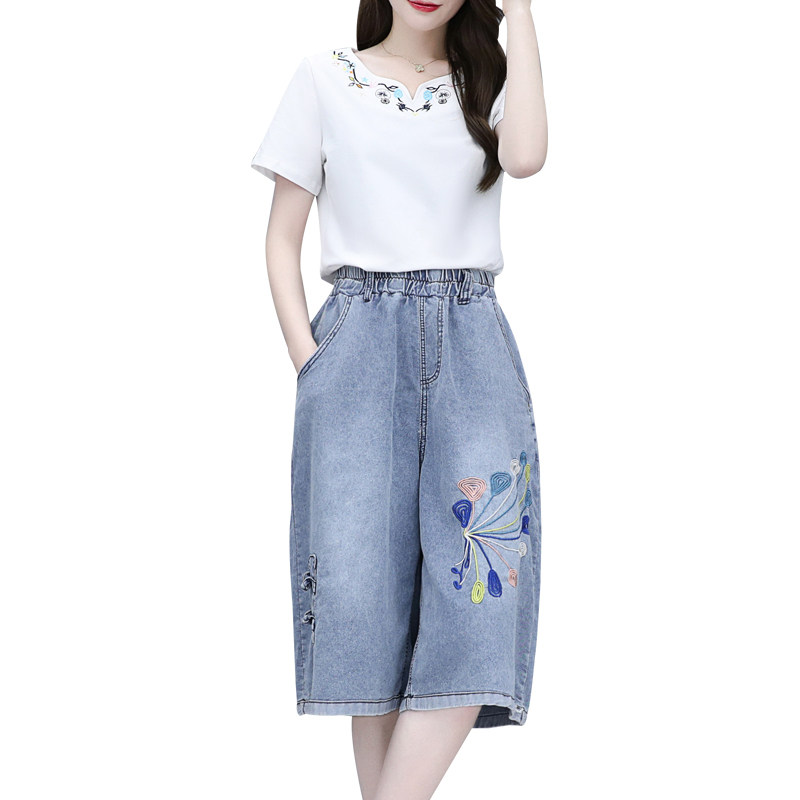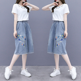 Джинсовая юбка, комплект, этническая футболка, в западном стиле, этнический стиль