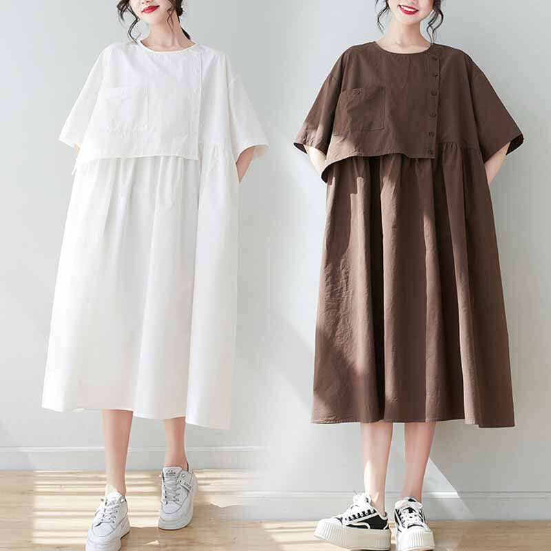 Летнее однотонное платье с коротким рукавом для отдыха с круглым воротником, длинная юбка, большой размер, по фигуре, средней длины