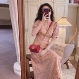 Летняя ретро длинная юбка, приталенный розовый шифоновый корсет, платье, V-образный вырез, в цветочек