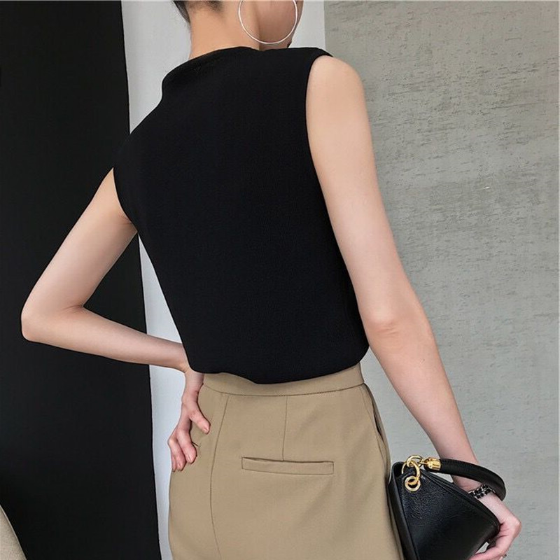 Трикотажный жилет, тонкая майка топ, черная короткая приталенная футболка без рукавов с круглым воротником, французский стиль