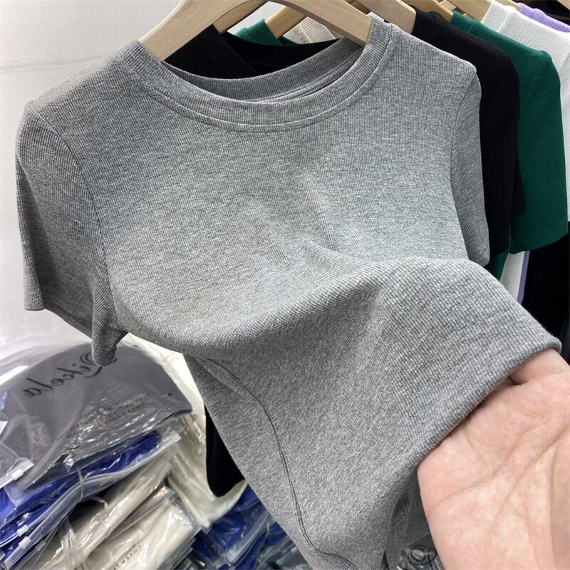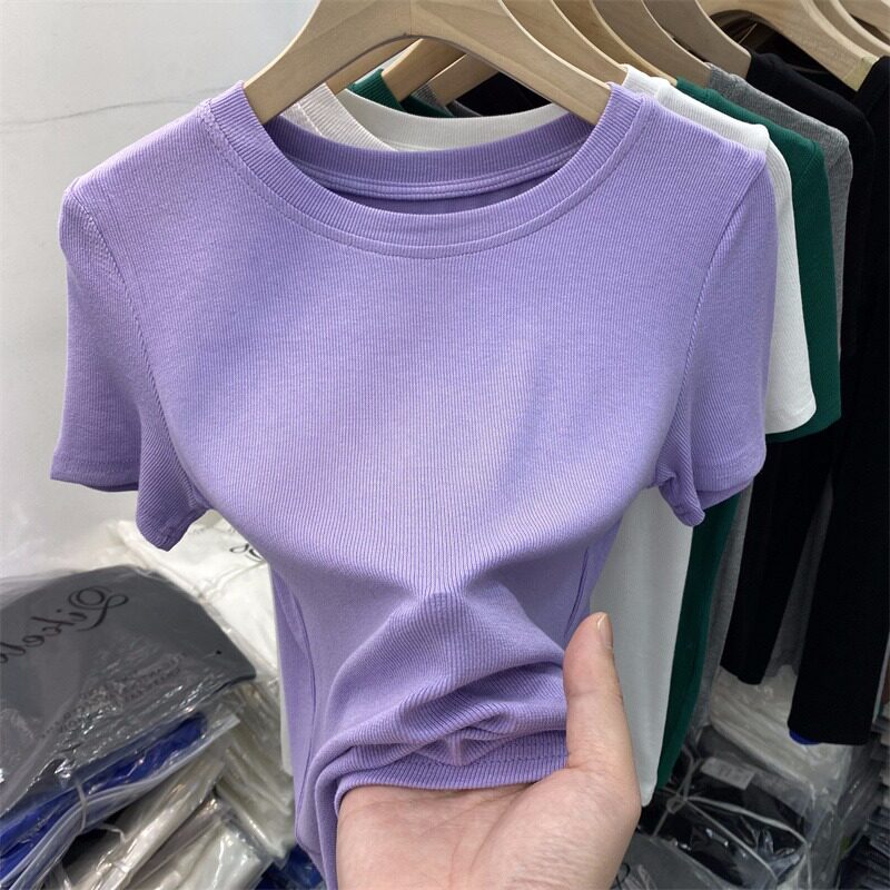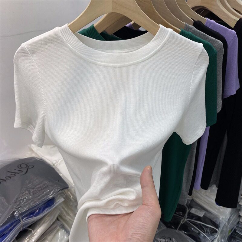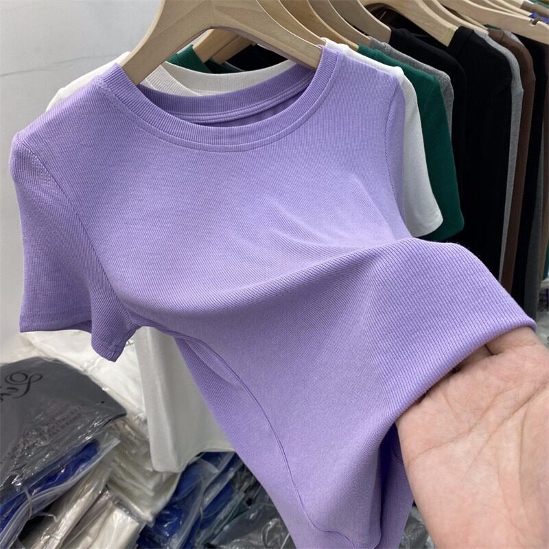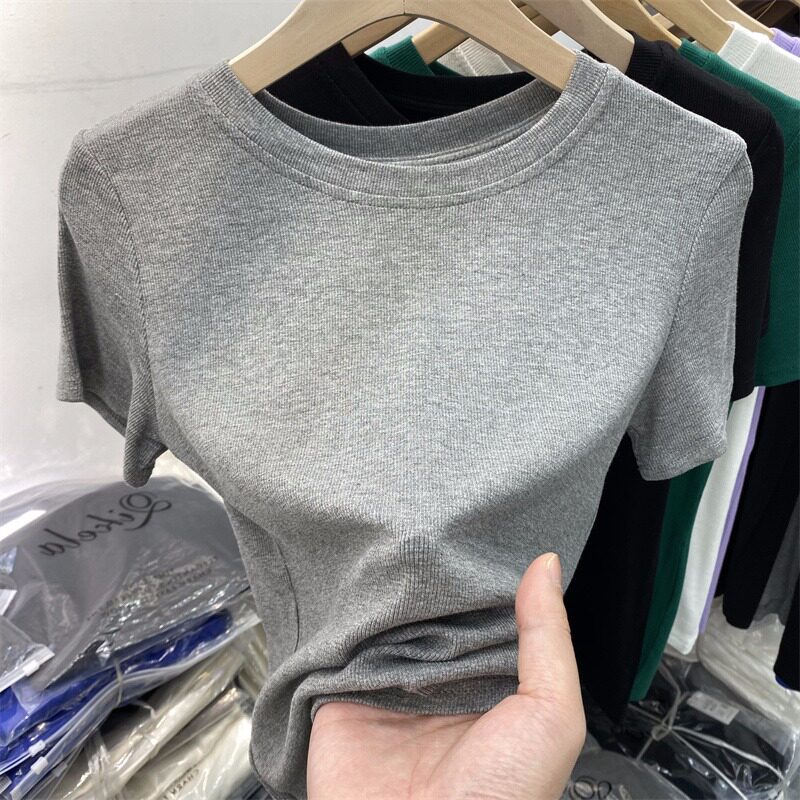 Летняя базовая приятная телу футболка с коротким рукавом с круглым воротником, в обтяжку