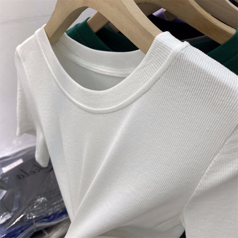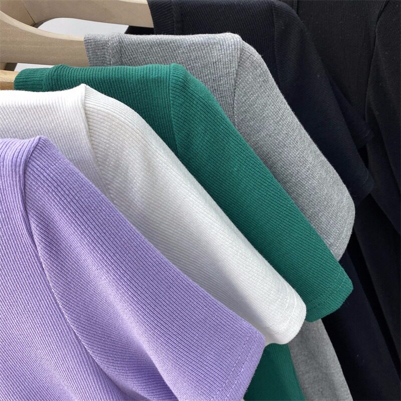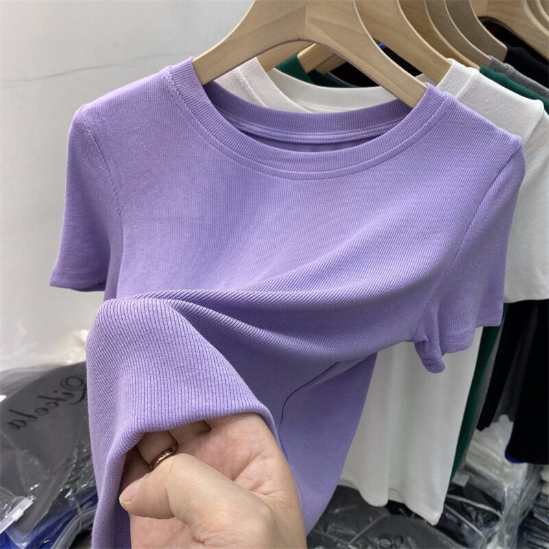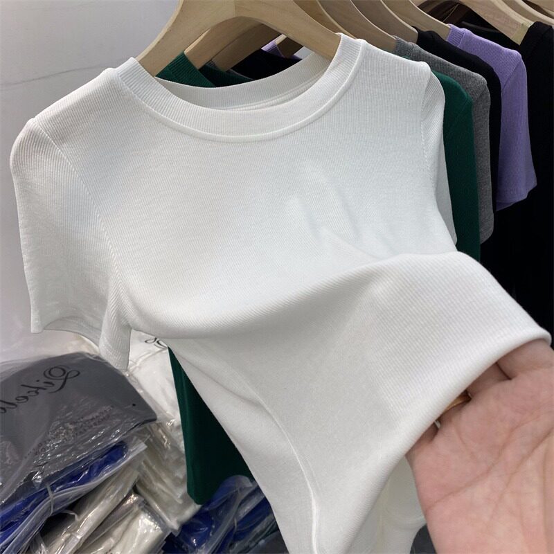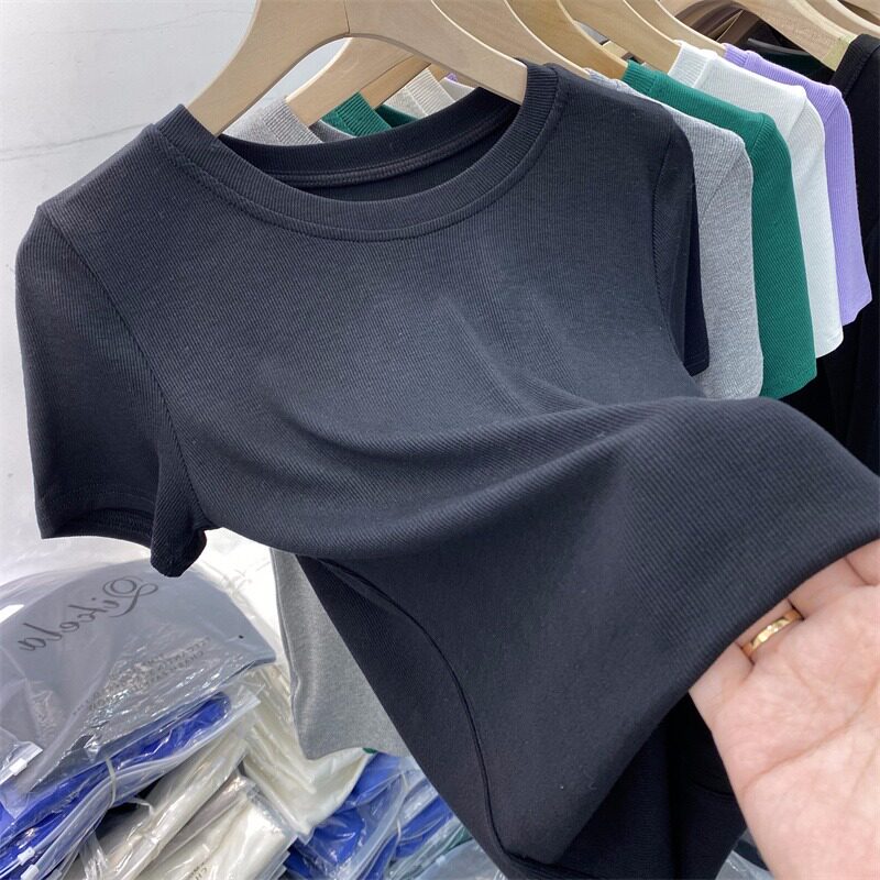 Летняя базовая приятная телу футболка с коротким рукавом с круглым воротником, в обтяжку