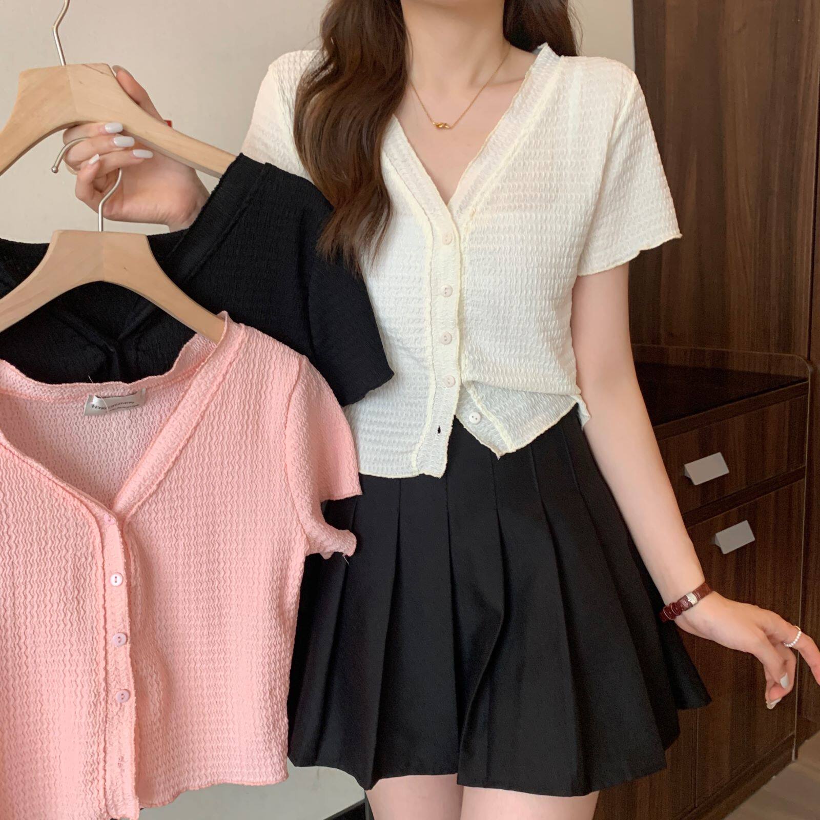 Короткая летняя вместительная и большая рубашка, дизайнерская футболка, V-образный вырез, по фигуре, большой размер, тренд сезона, короткий рукав