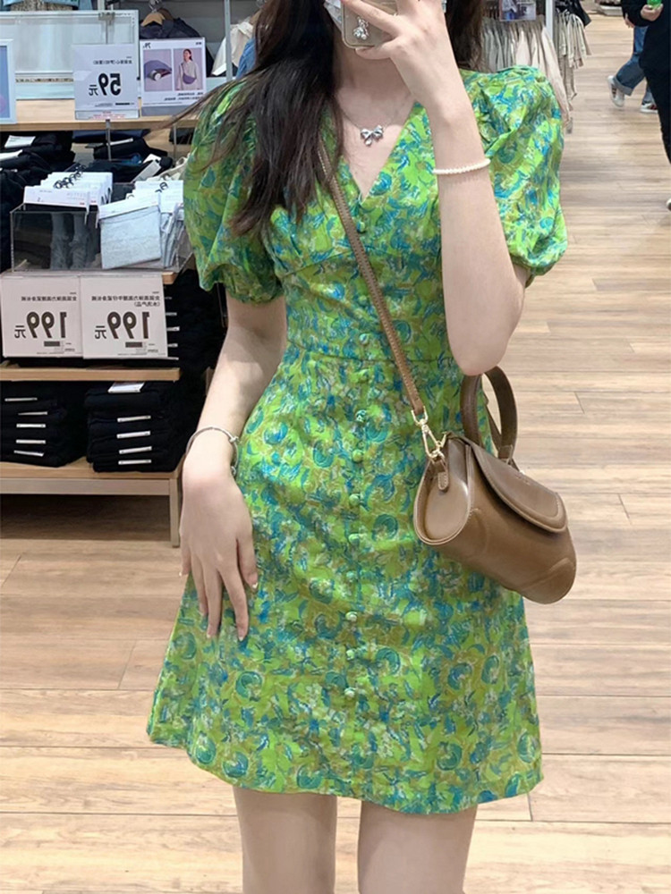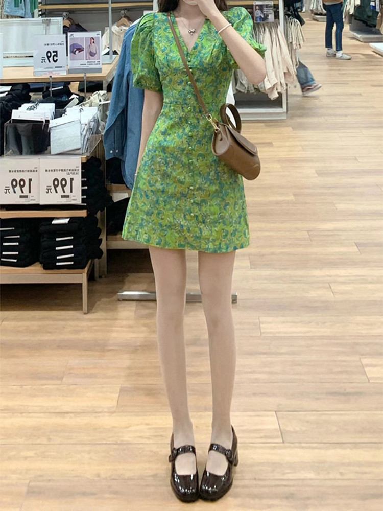 Летний милый приталенный корсет, мини-юбка, платье, V-образный вырез, в западном стиле, французский стиль, в цветочек