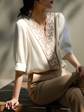 Ретро шелковая летняя модная рубашка, V-образный вырез, с вышивкой