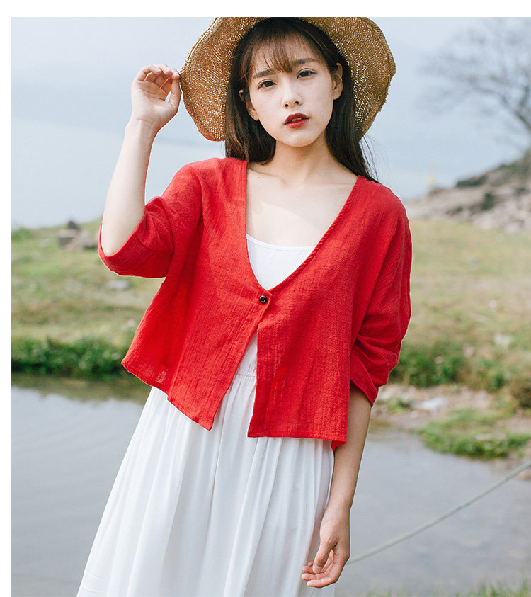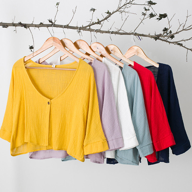 Летний ретро мягкий короткий цветной кардиган, рубашка, из хлопка и льна, оверсайз, защита от солнца