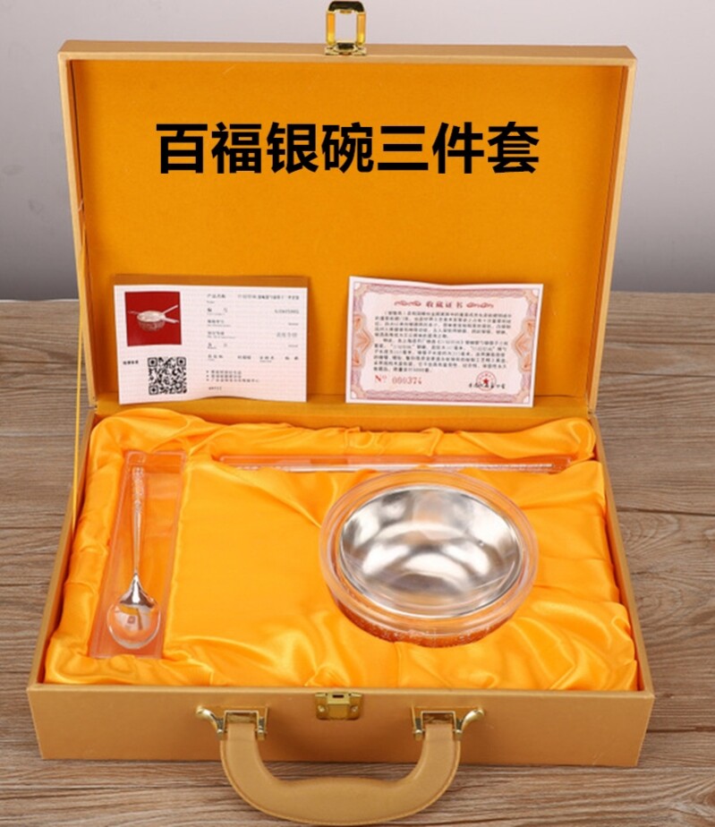 Три набора серебряных мисок и палочек для еды, подарочная коробка, детский набор, миска Байфу, детская ложка, серебряные палочки для еды, подарок на день рождения.