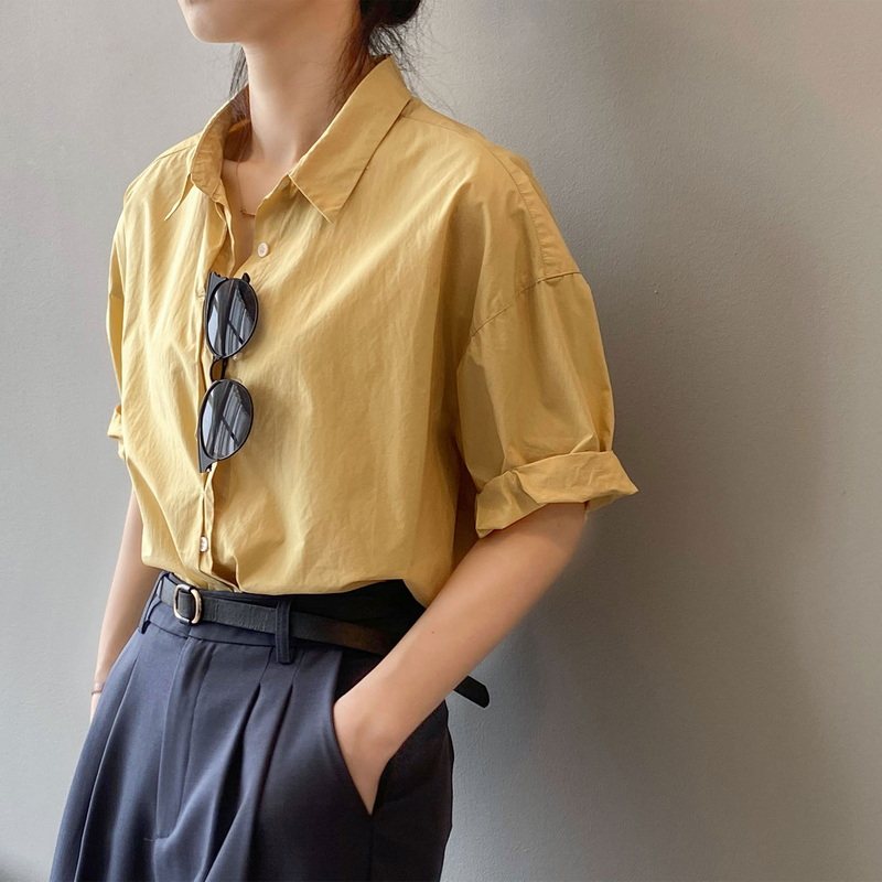 Желтая брендовая небольшая дизайнерская рубашка, короткий рукав, тренд сезона, японские и корейские, стиль