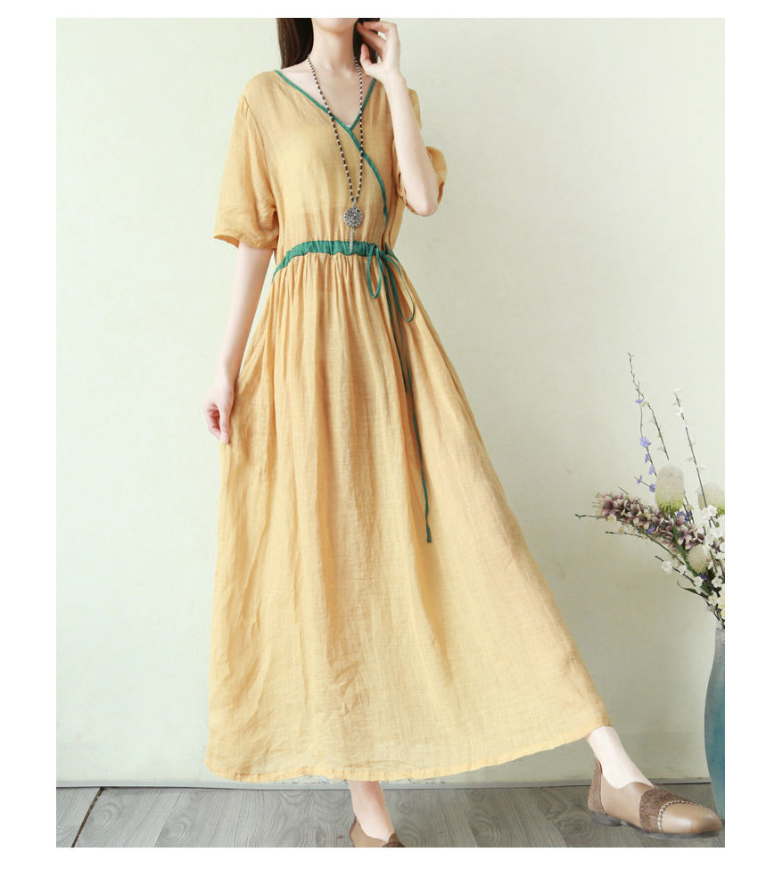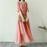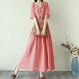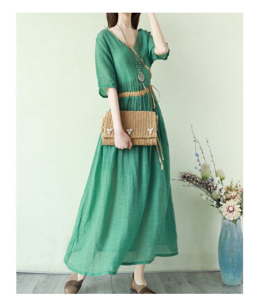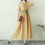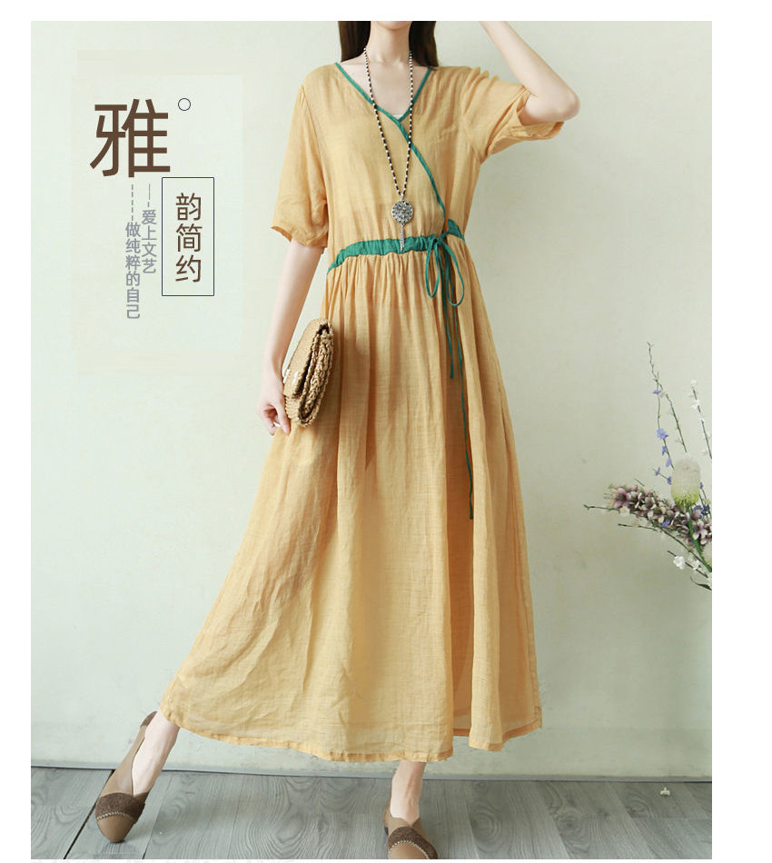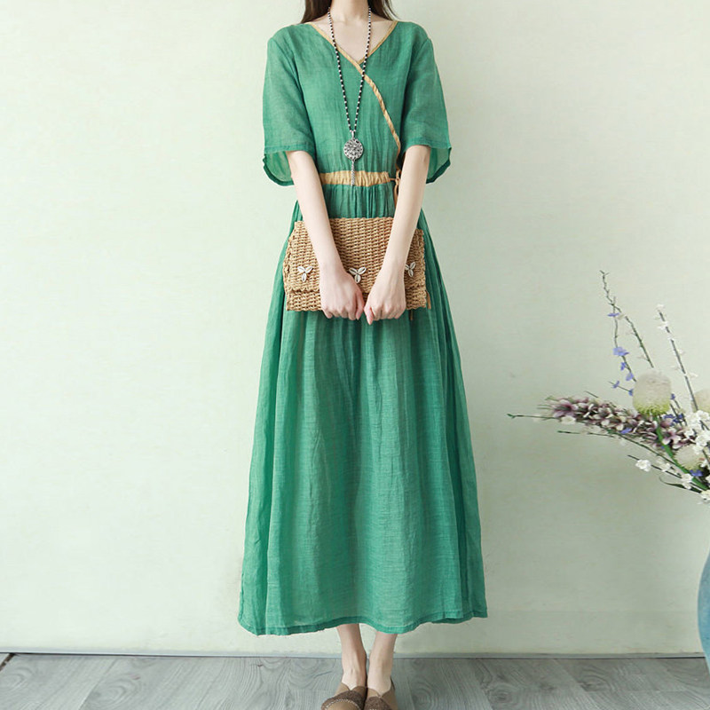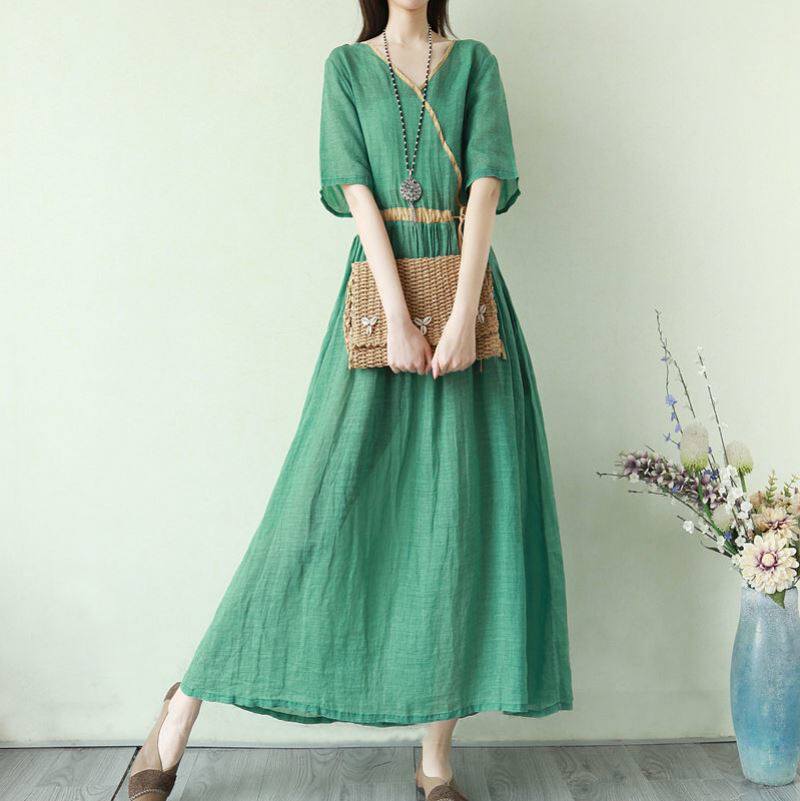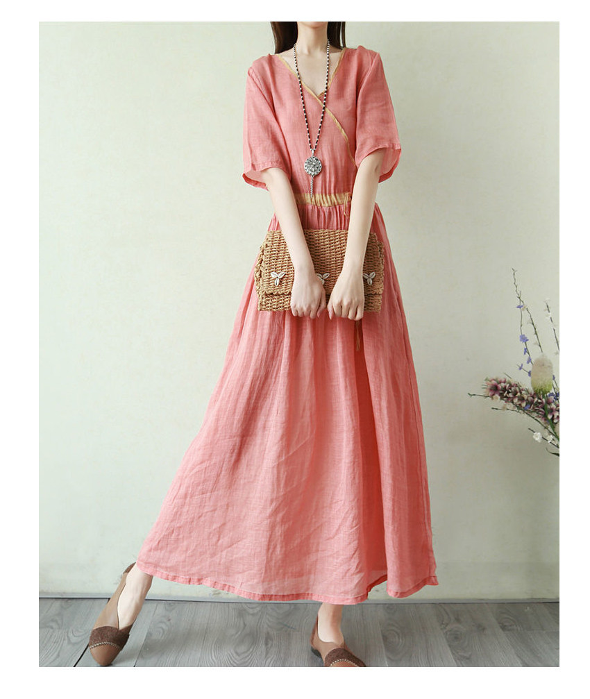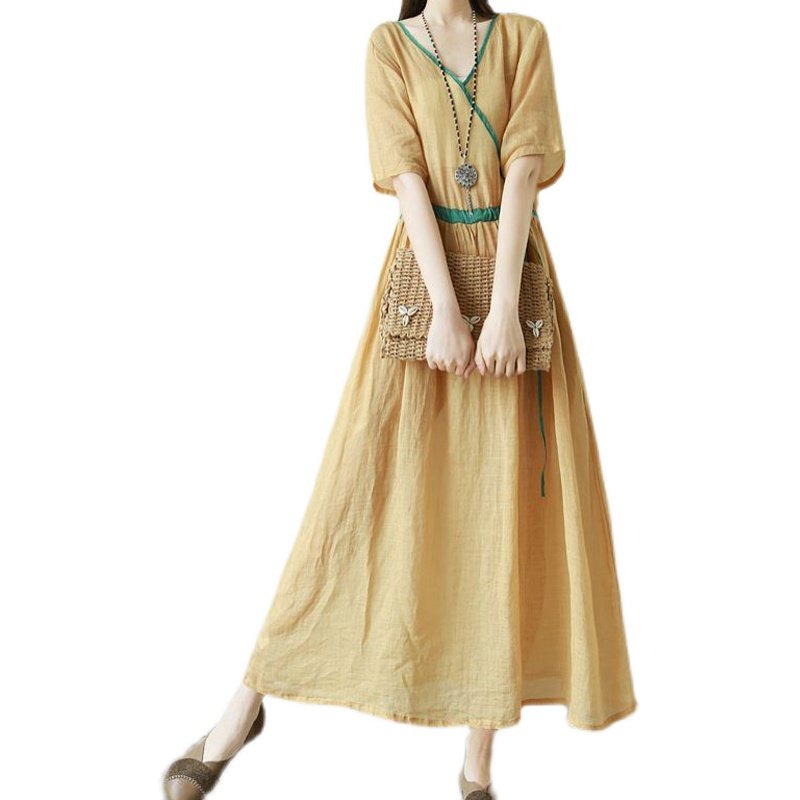 Тонкое этническое платье, однотонная длинная юбка, приталенный корсет, из хлопка и льна, этнический стиль, короткий рукав, V-образный вырез