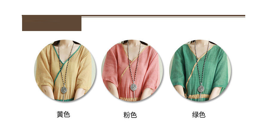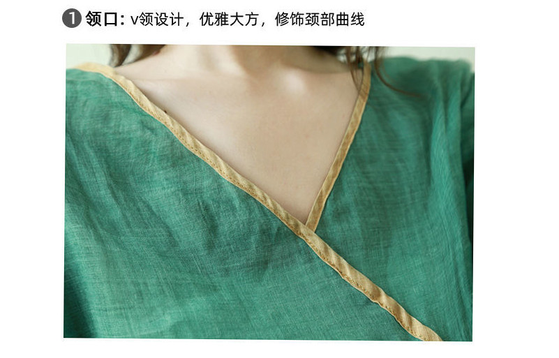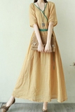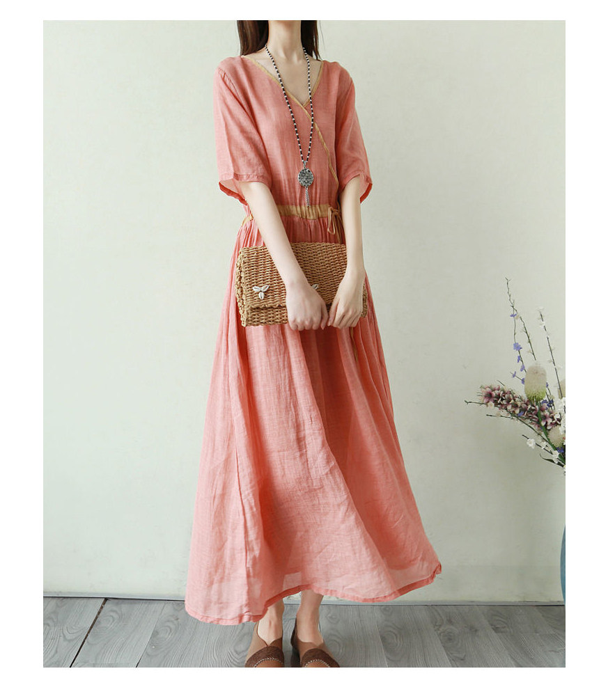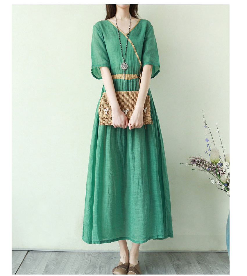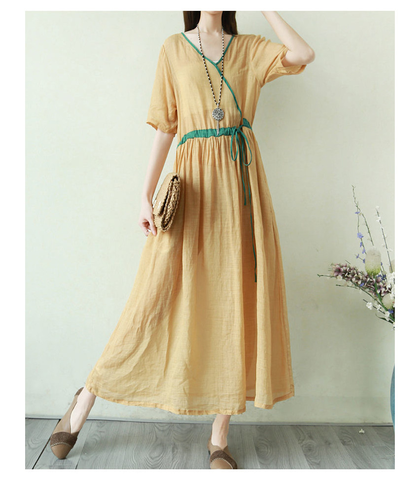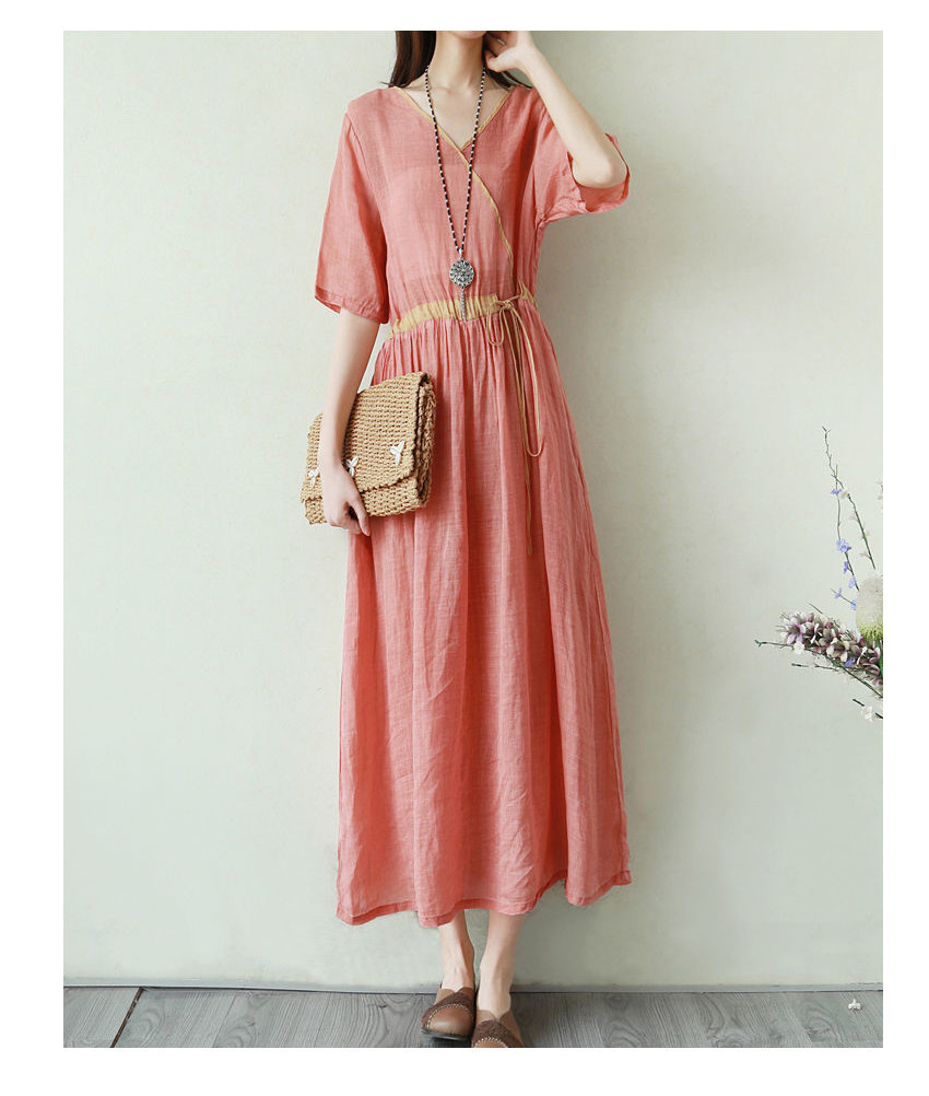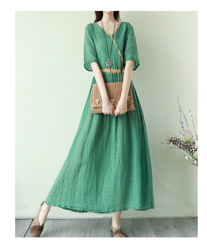 Тонкое этническое платье, однотонная длинная юбка, приталенный корсет, из хлопка и льна, этнический стиль, короткий рукав, V-образный вырез