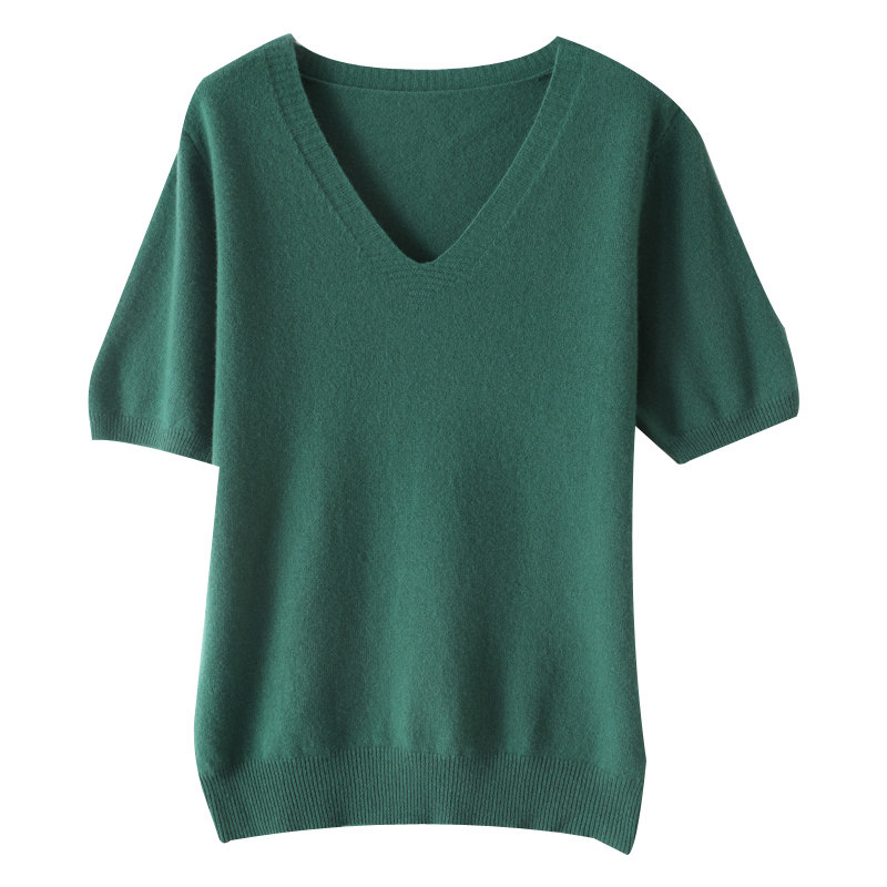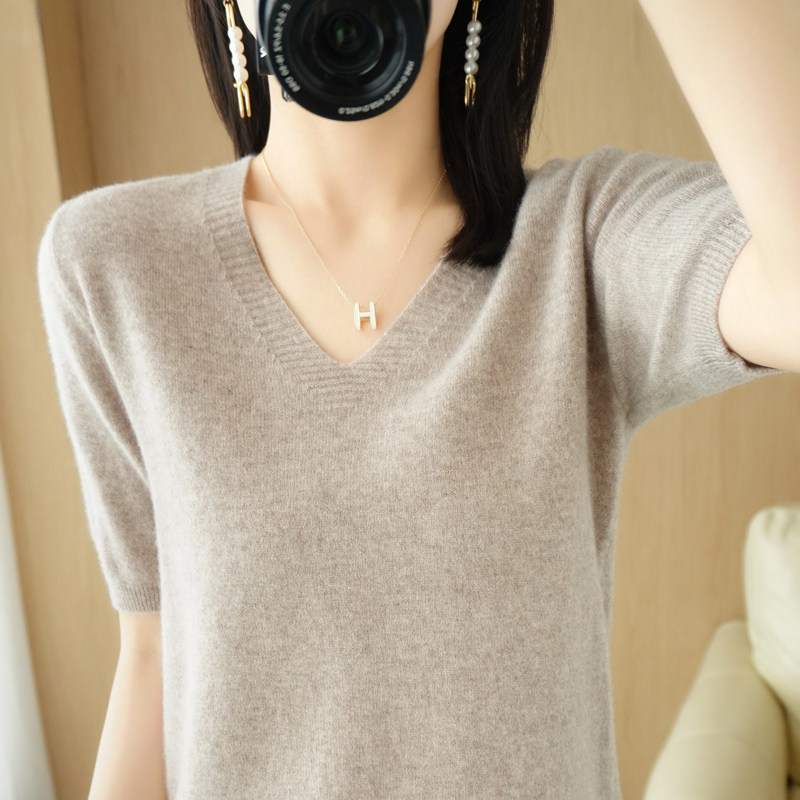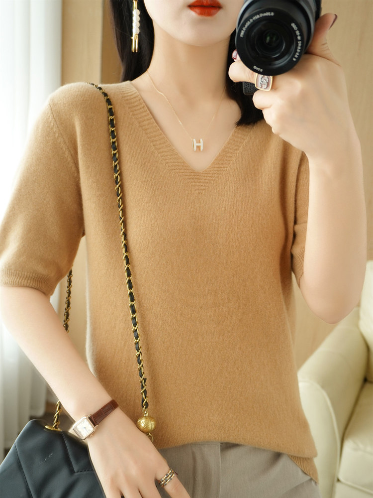 Вязаная женская топ-тонкий тонкий V-образный выстрел с короткими рукавами