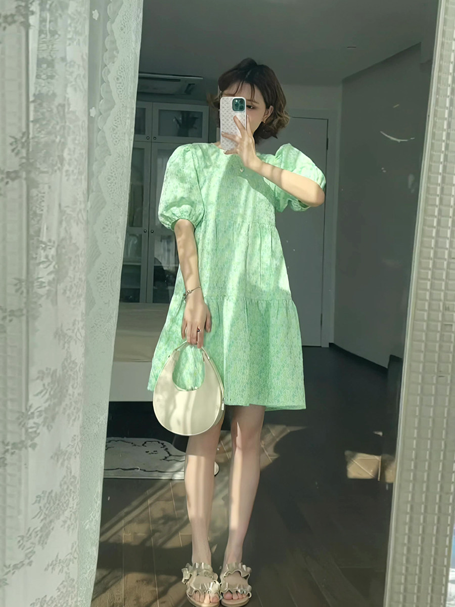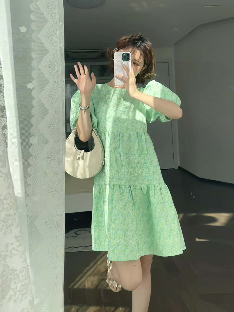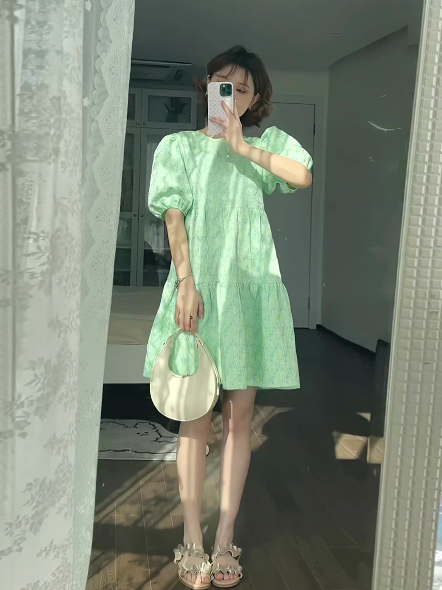 Зеленое летнее милое платье, свежая юбка с бантиком, рукава фонарики, в цветочек, юбка-пачка