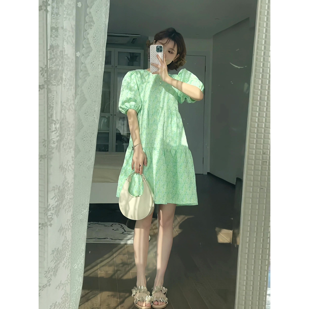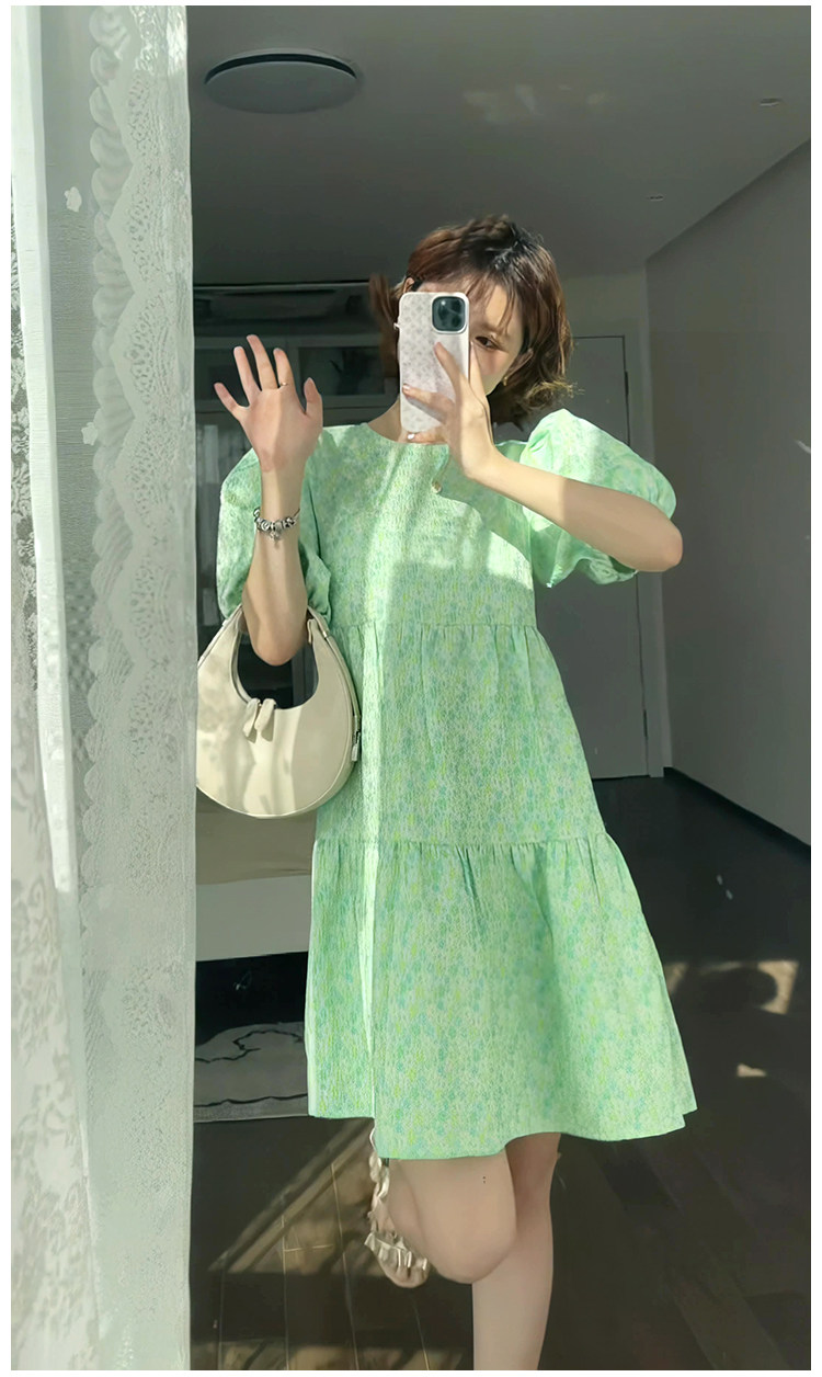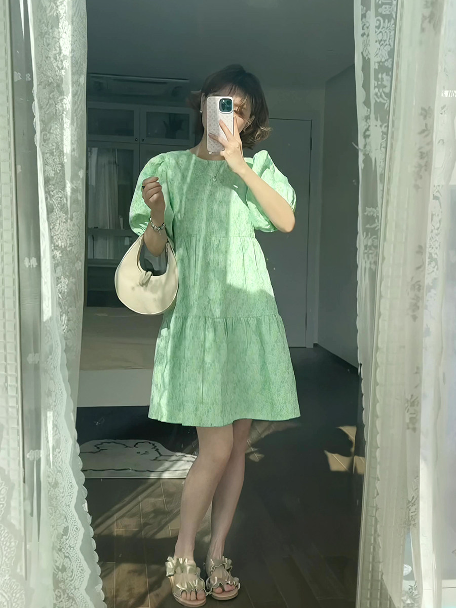 Зеленое летнее милое платье, свежая юбка с бантиком, рукава фонарики, в цветочек, юбка-пачка