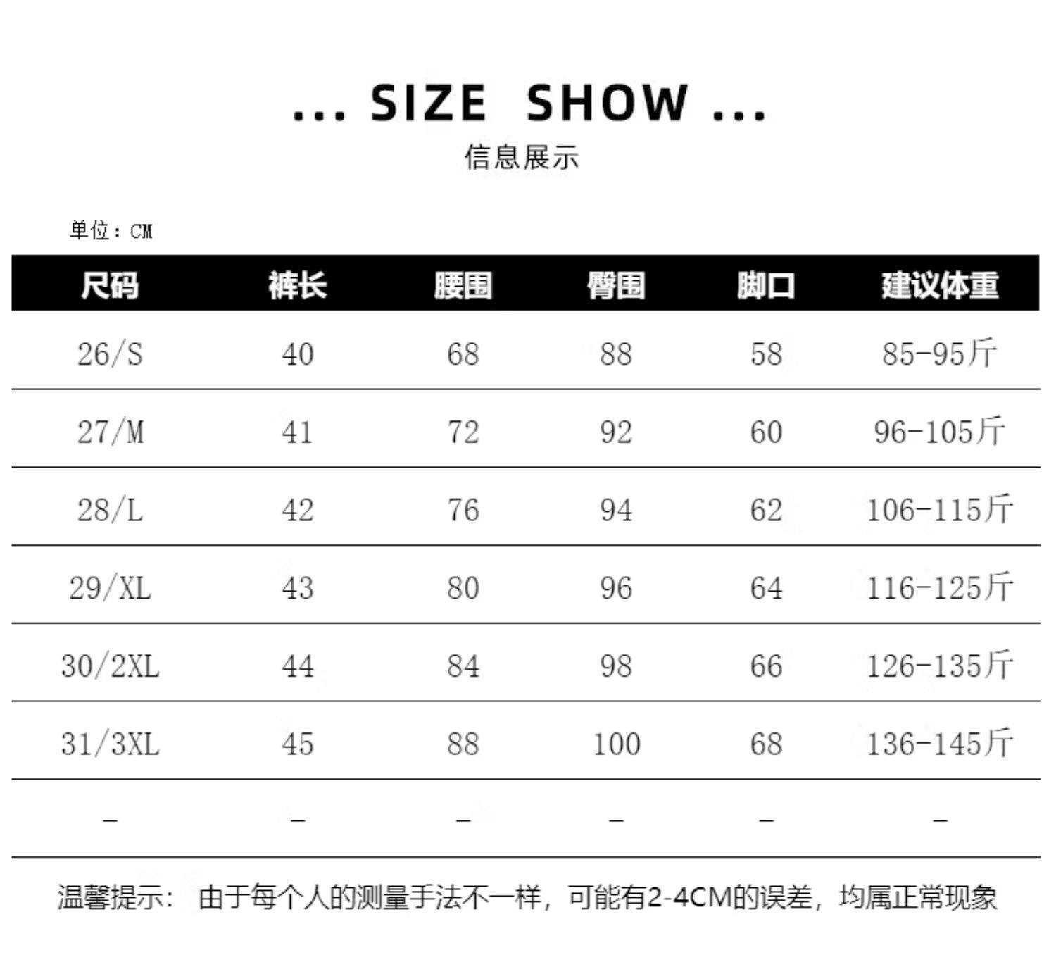 | Размер: | 26/с предложение 85-95 Catties, 27/м предложение 96-105 Catties, 28/L Рекомендуется 106-115 кот, 29/XL Предложение 116-125 Catties, 30/2xl Предложение 126-135 Catties, 31/3xl Предложение 136-145 кот |