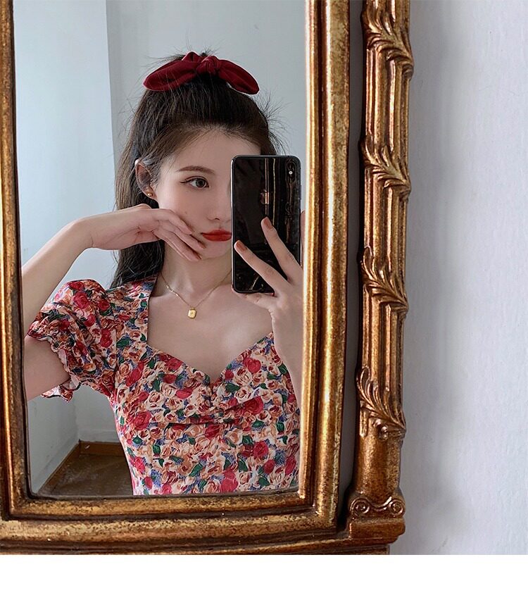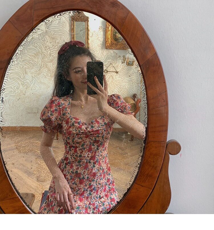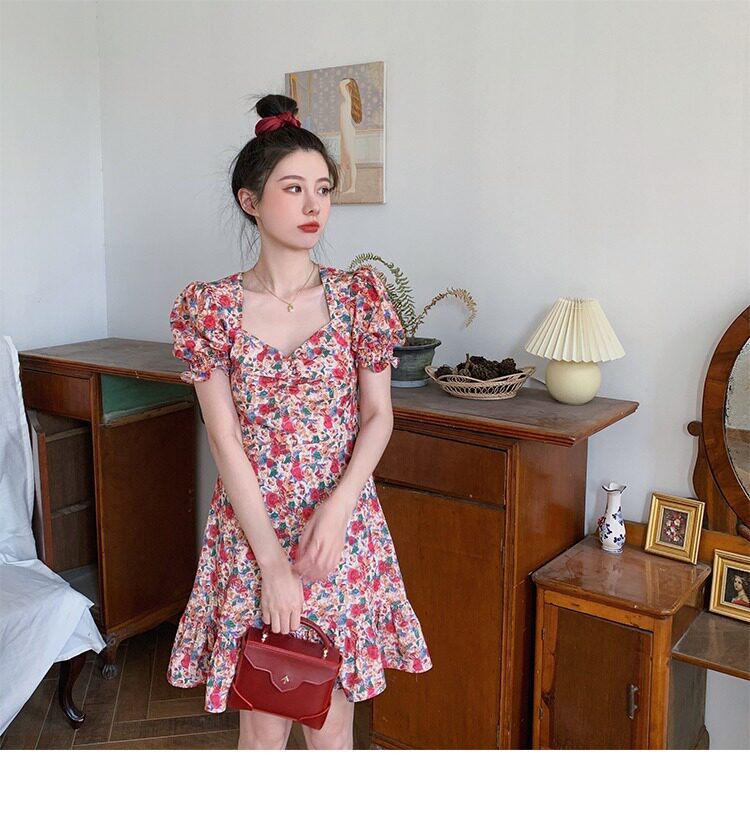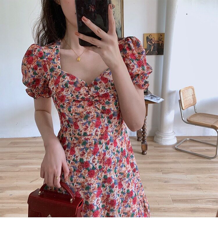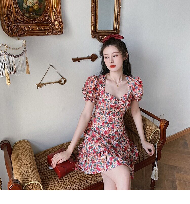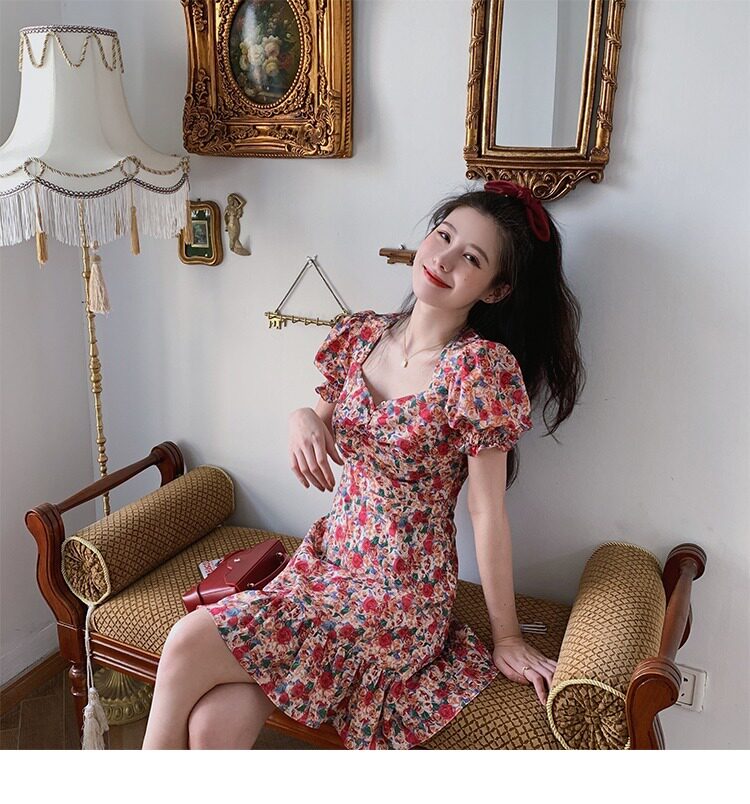 Ретро летняя юбка, корсет, платье, французский ретро стиль, квадратный вырез, рукава фонарики, в цветочек