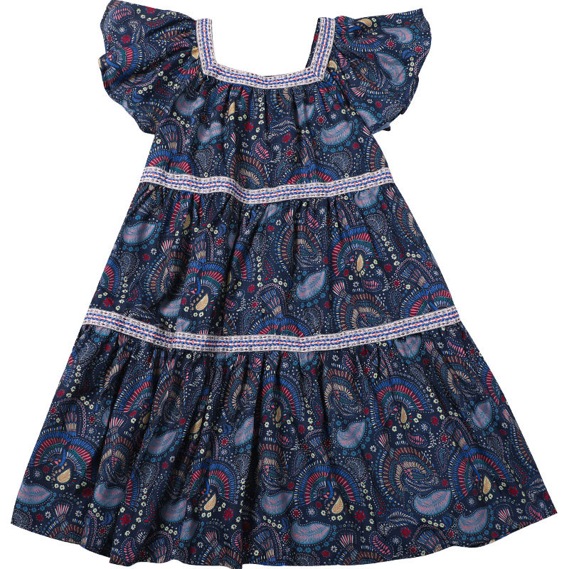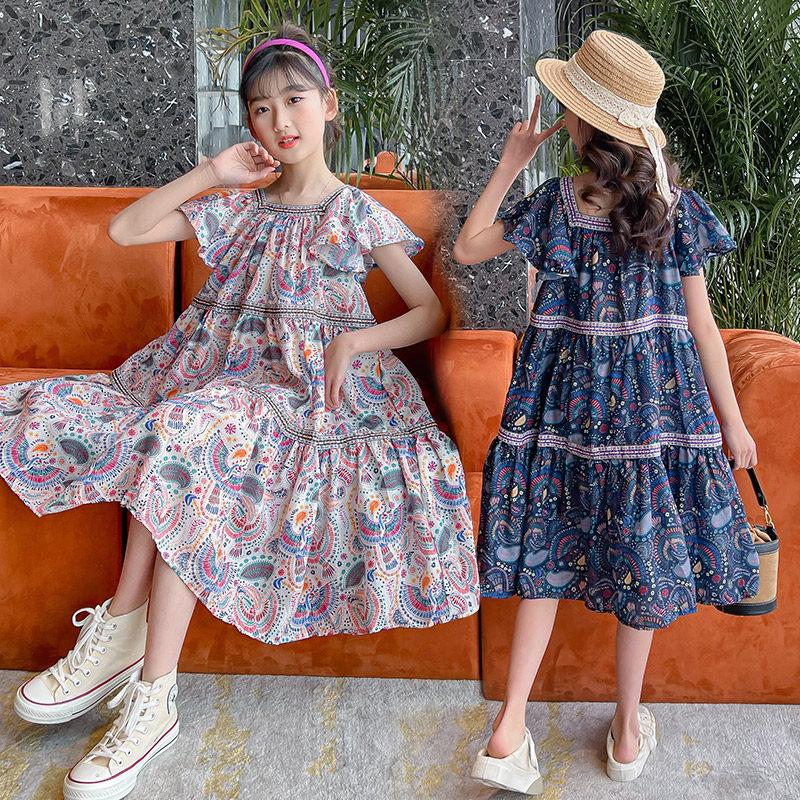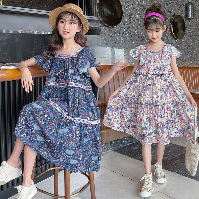 Летнее шифоновое длинное платье, в западном стиле, подходит для подростков, короткий рукав, стиль бохо, средней длины