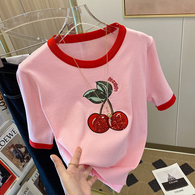 Блестки для ногтей, красная шелковая короткая летняя футболка с коротким рукавом, с вышивкой, коллекция 2022