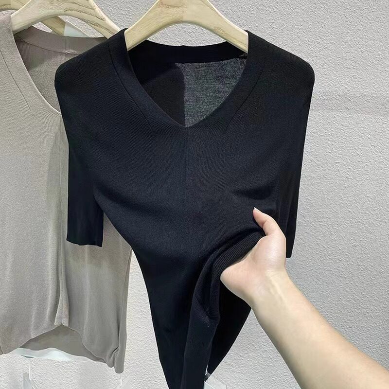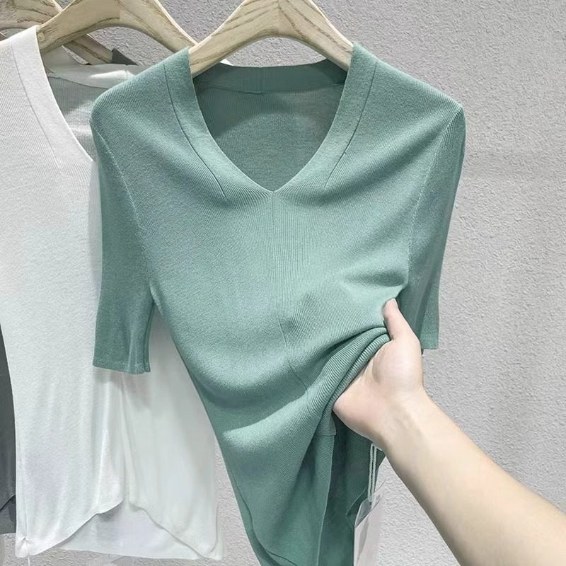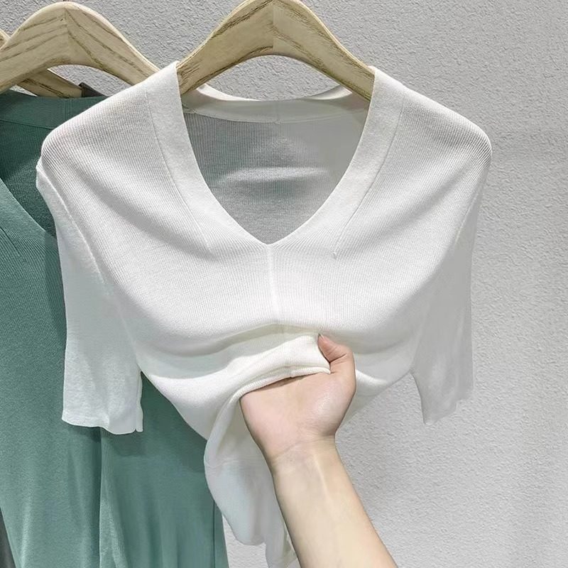 Летняя футболка, трикотажный приталенный тонкий свитер, V-образный вырез