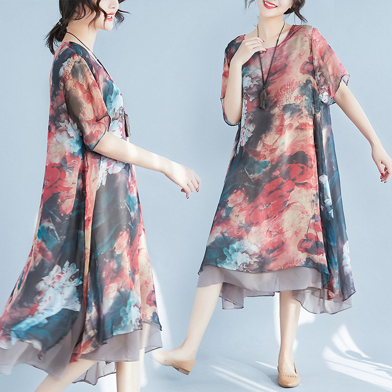 Летняя одежда, шифоновое летнее платье, подходит для полных девушек, большой размер, свободный крой, короткий рукав