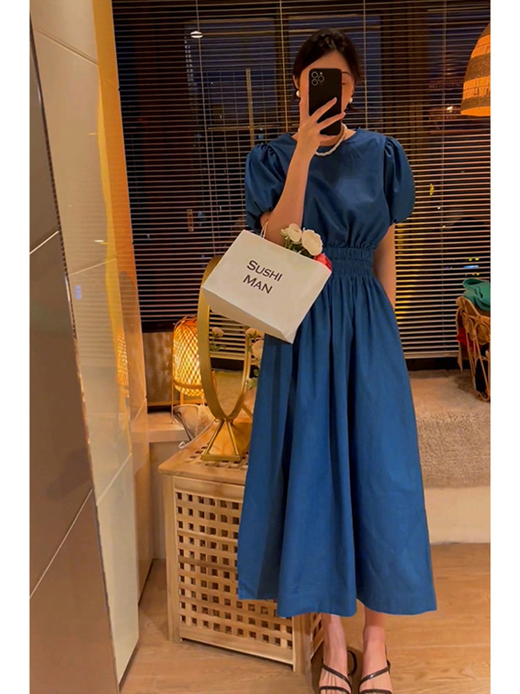 Летнее синее ретро платье, приталенная юбка, коллекция 2023, изысканный стиль, рукава фонарики