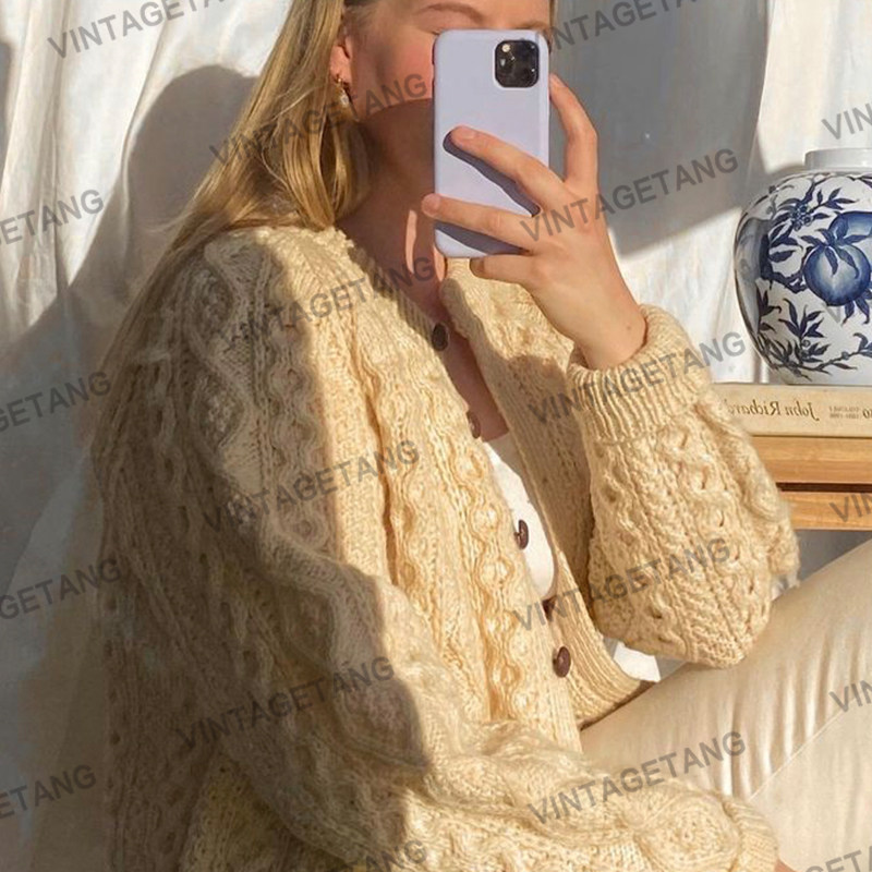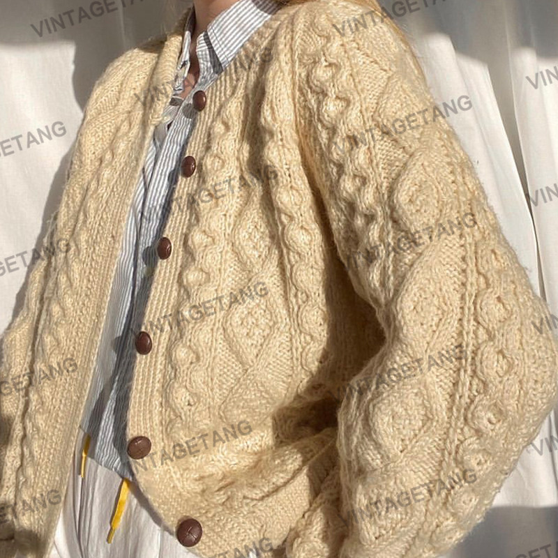 Ретро бежевый свитер, куртка, кардиган, в американском стиле, свободный крой