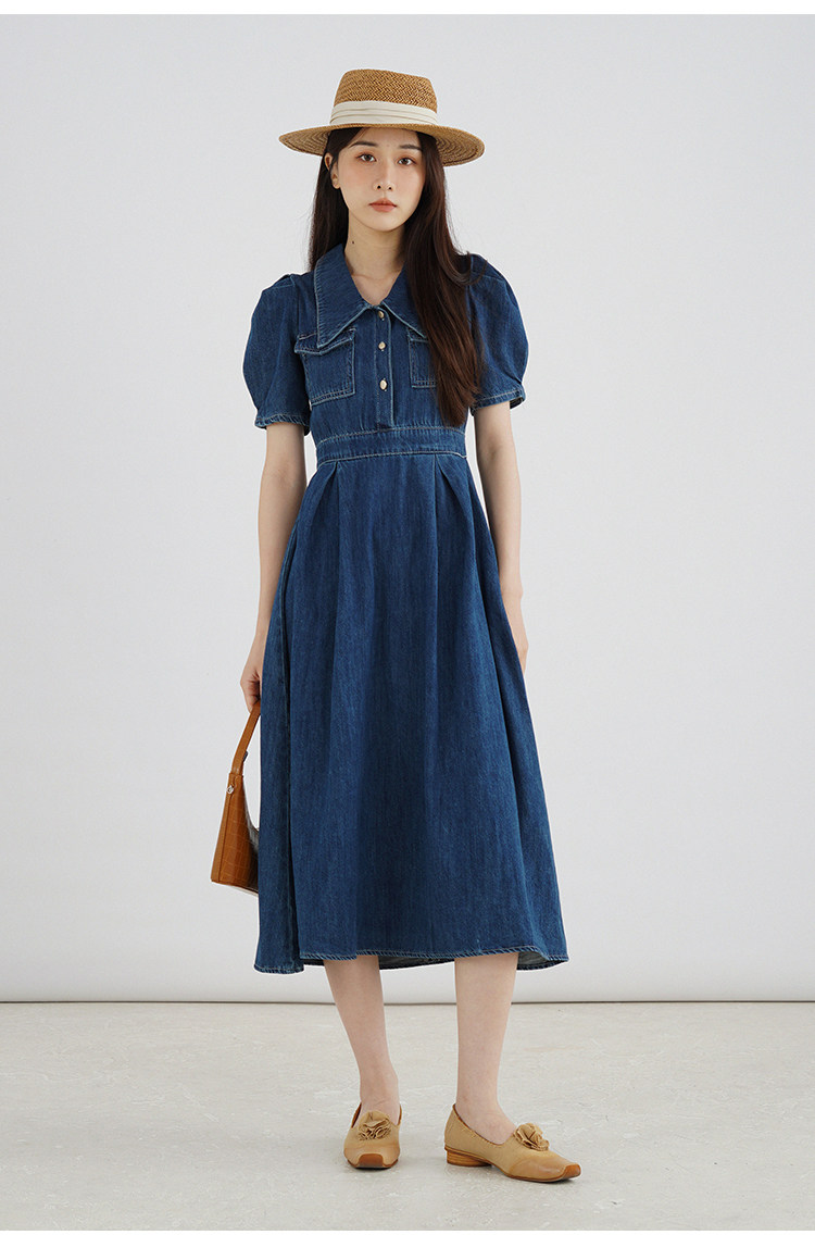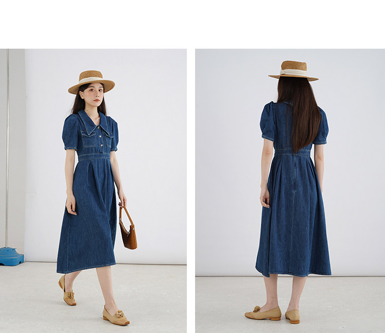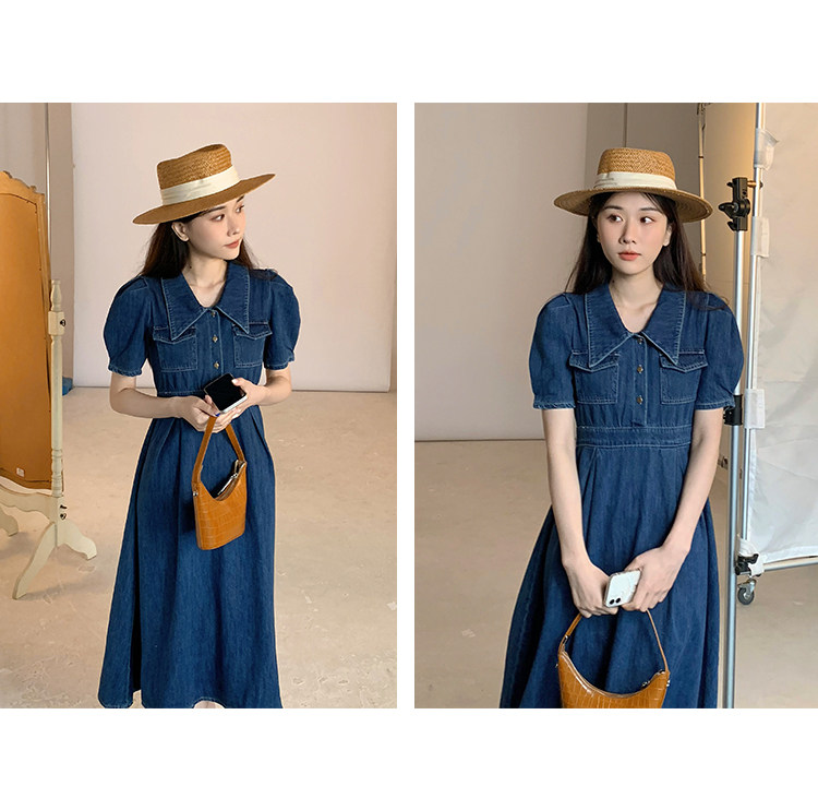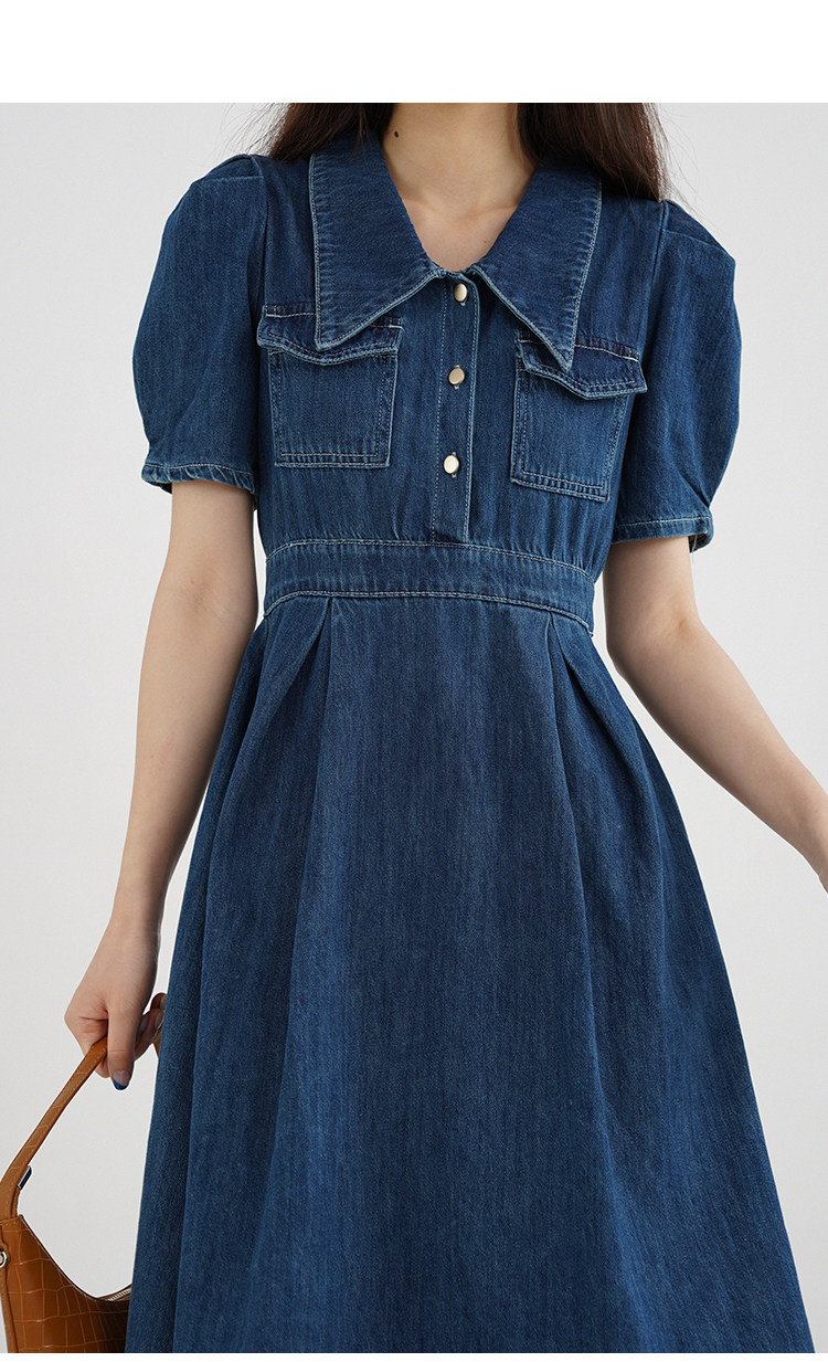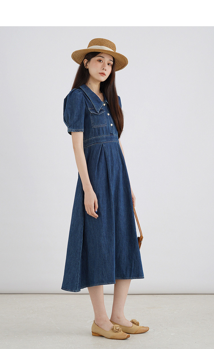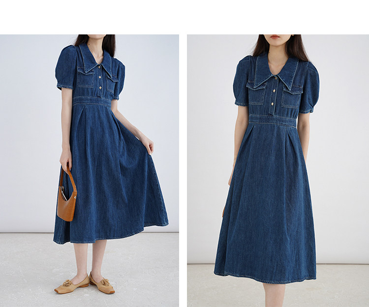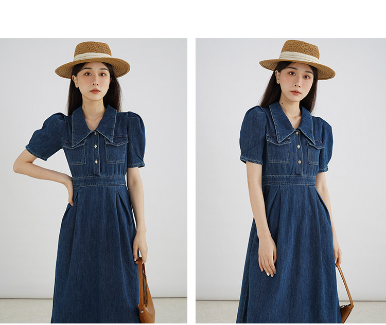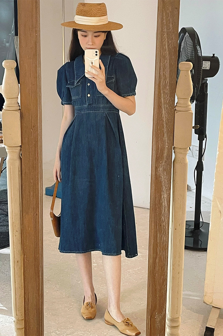 Джинсовое летнее ретро платье, элегантный приталенный корсет, длинная юбка, рукава фонарики, А-силуэт, средней длины