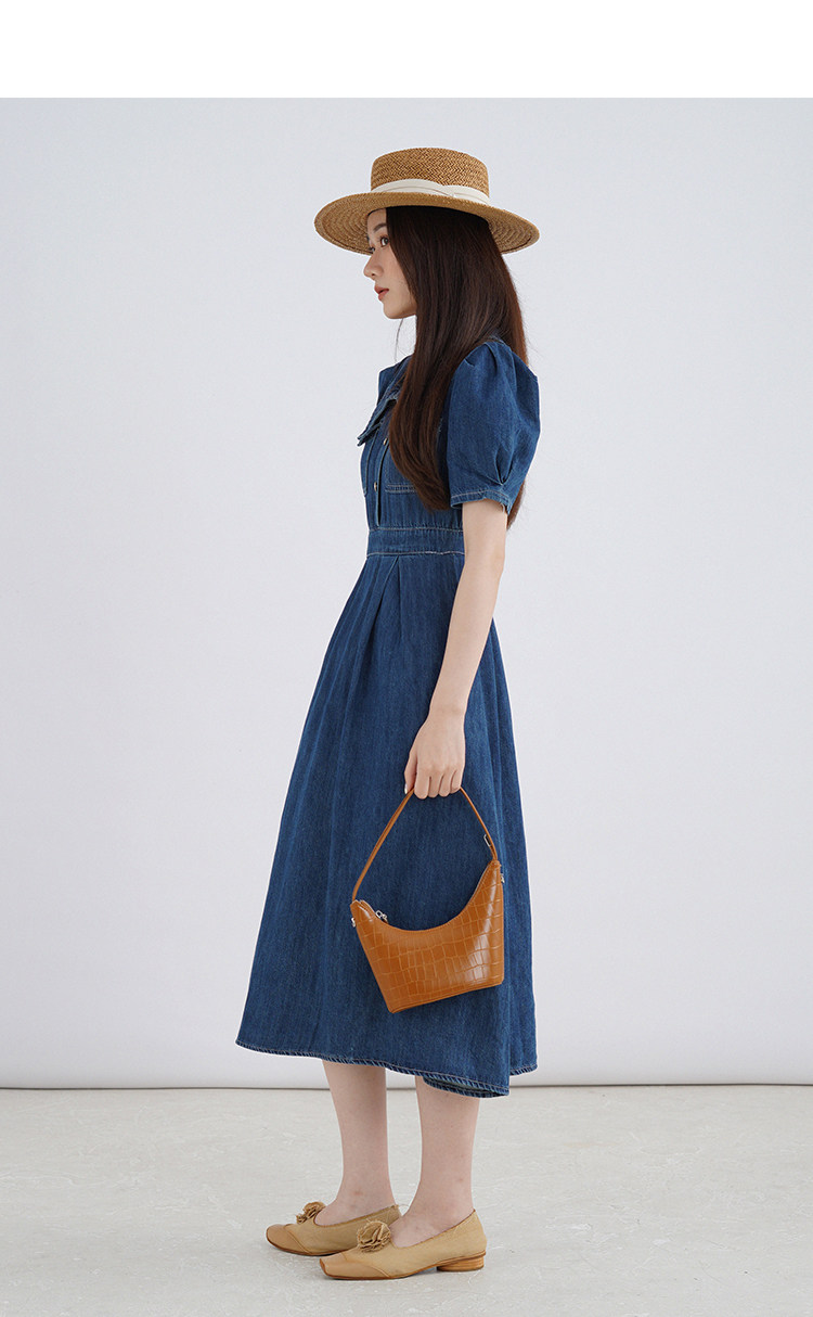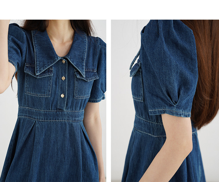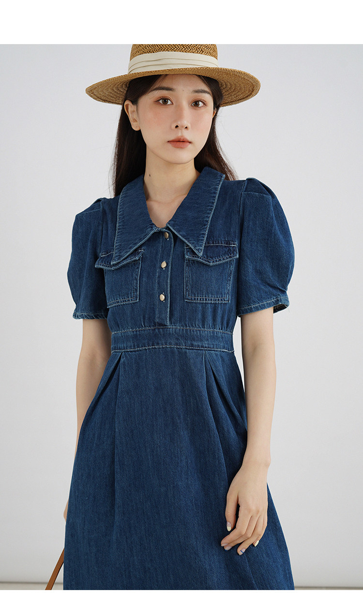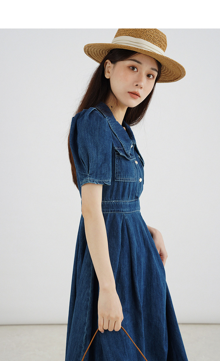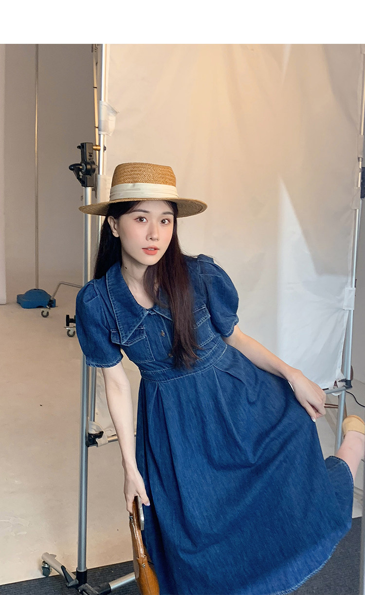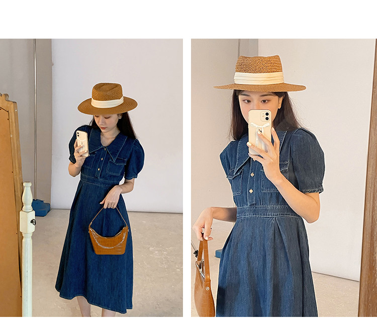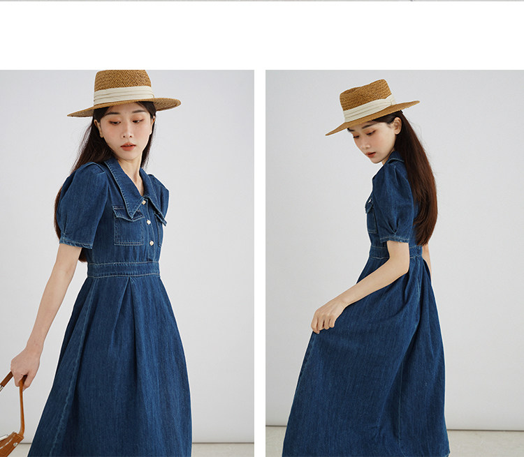 Джинсовое летнее ретро платье, элегантный приталенный корсет, длинная юбка, рукава фонарики, А-силуэт, средней длины