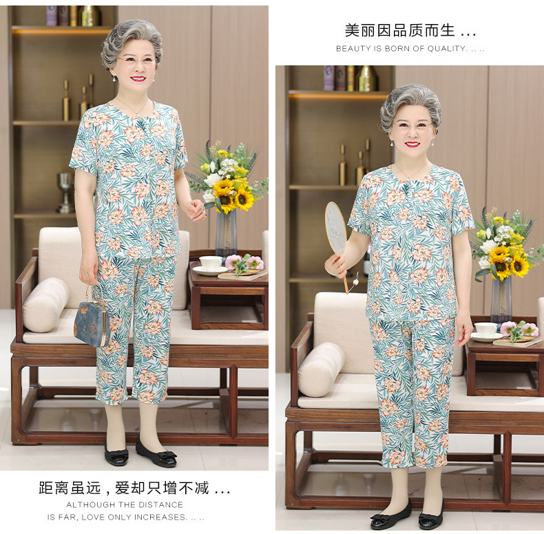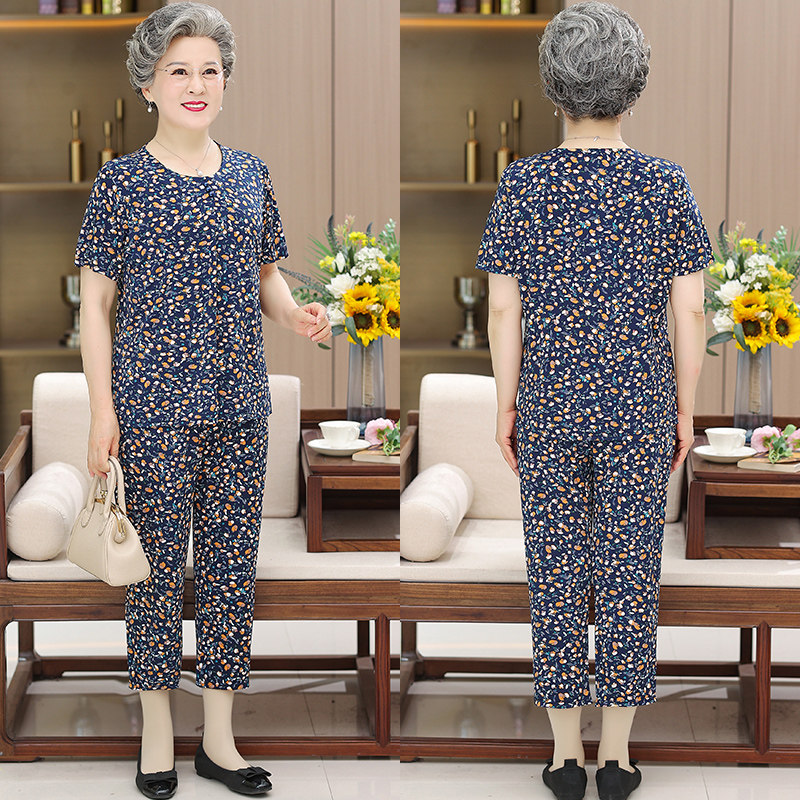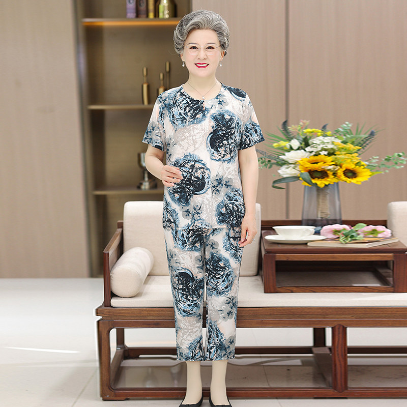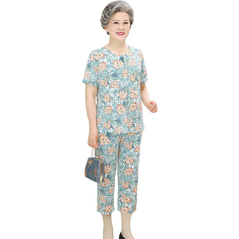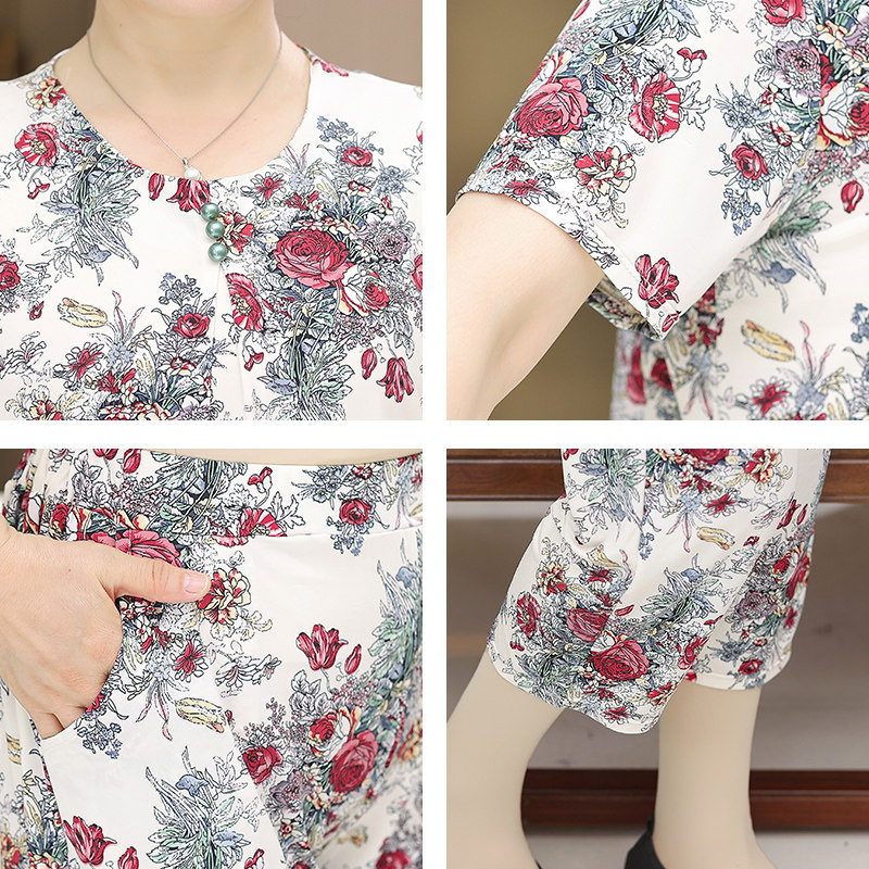 Летняя одежда, комплект для пожилых людей, шелковые нарукавники, для среднего возраста, 60 лет, короткий рукав, свободный крой, цветочный принт