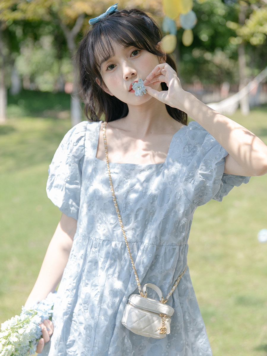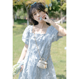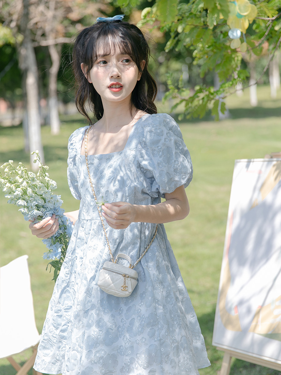 Синее летнее дизайнерское платье, тренд сезона, квадратный вырез, А-силуэт