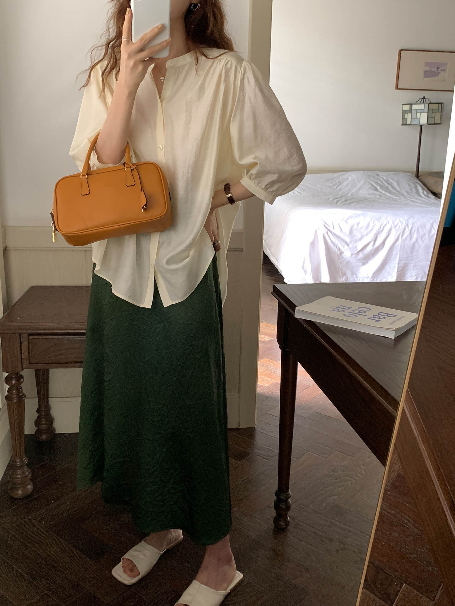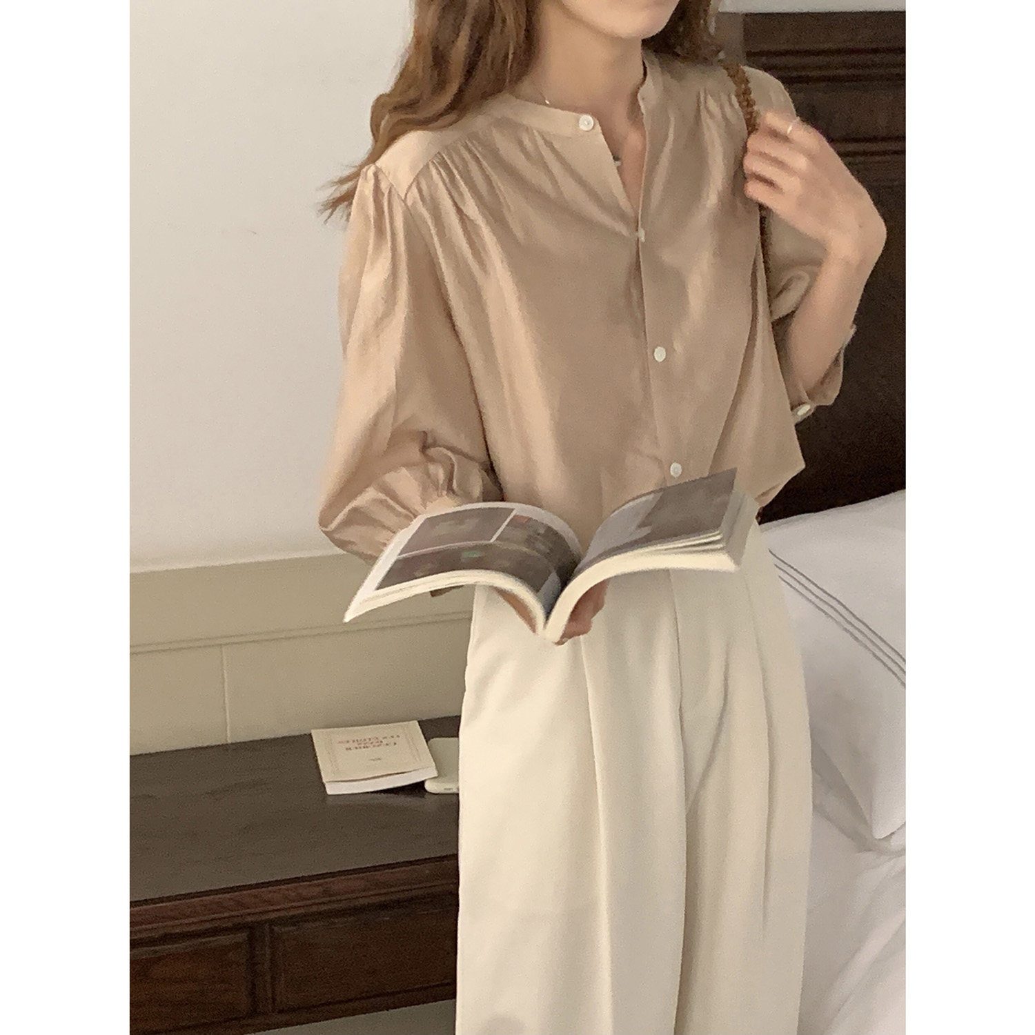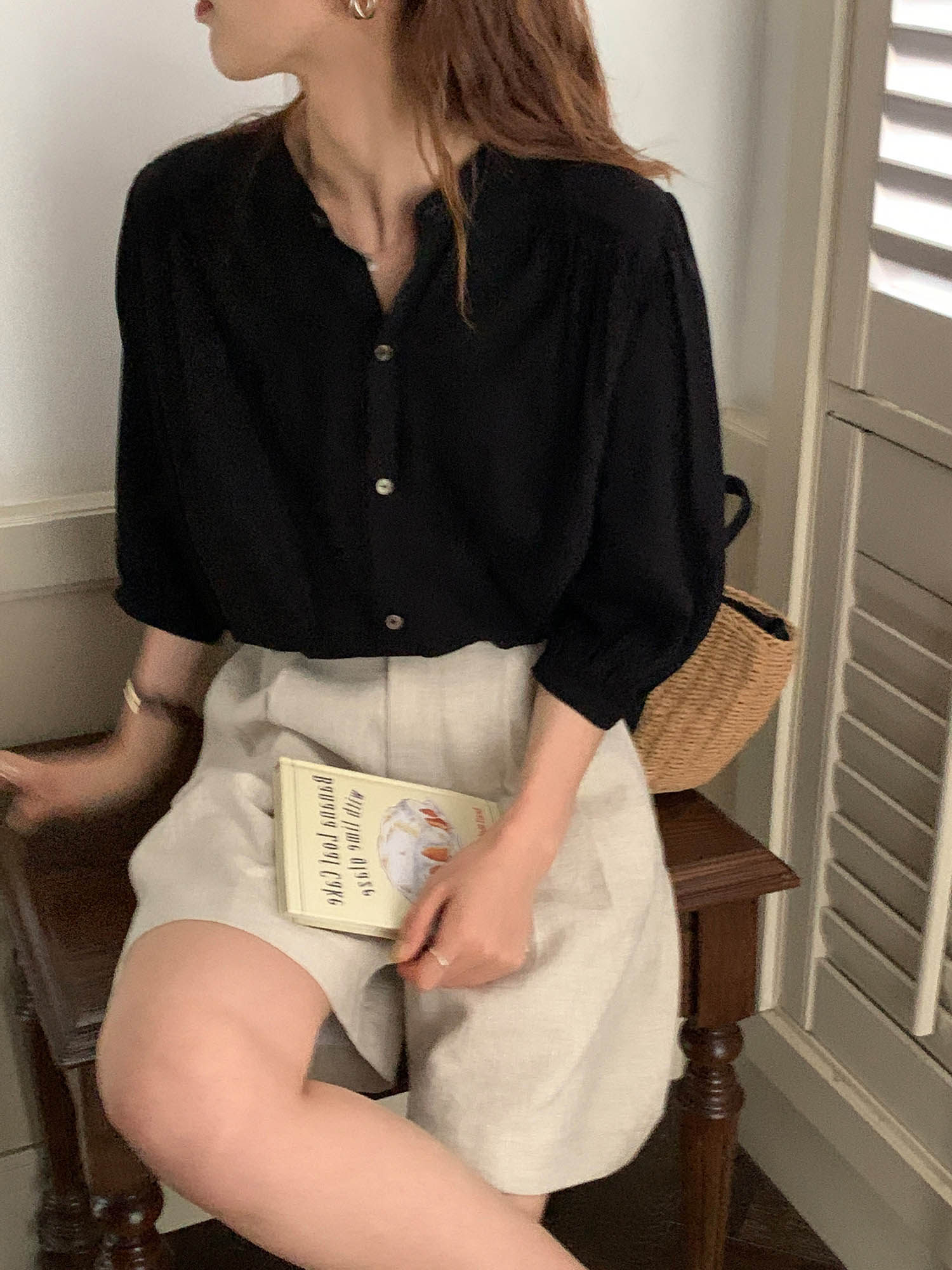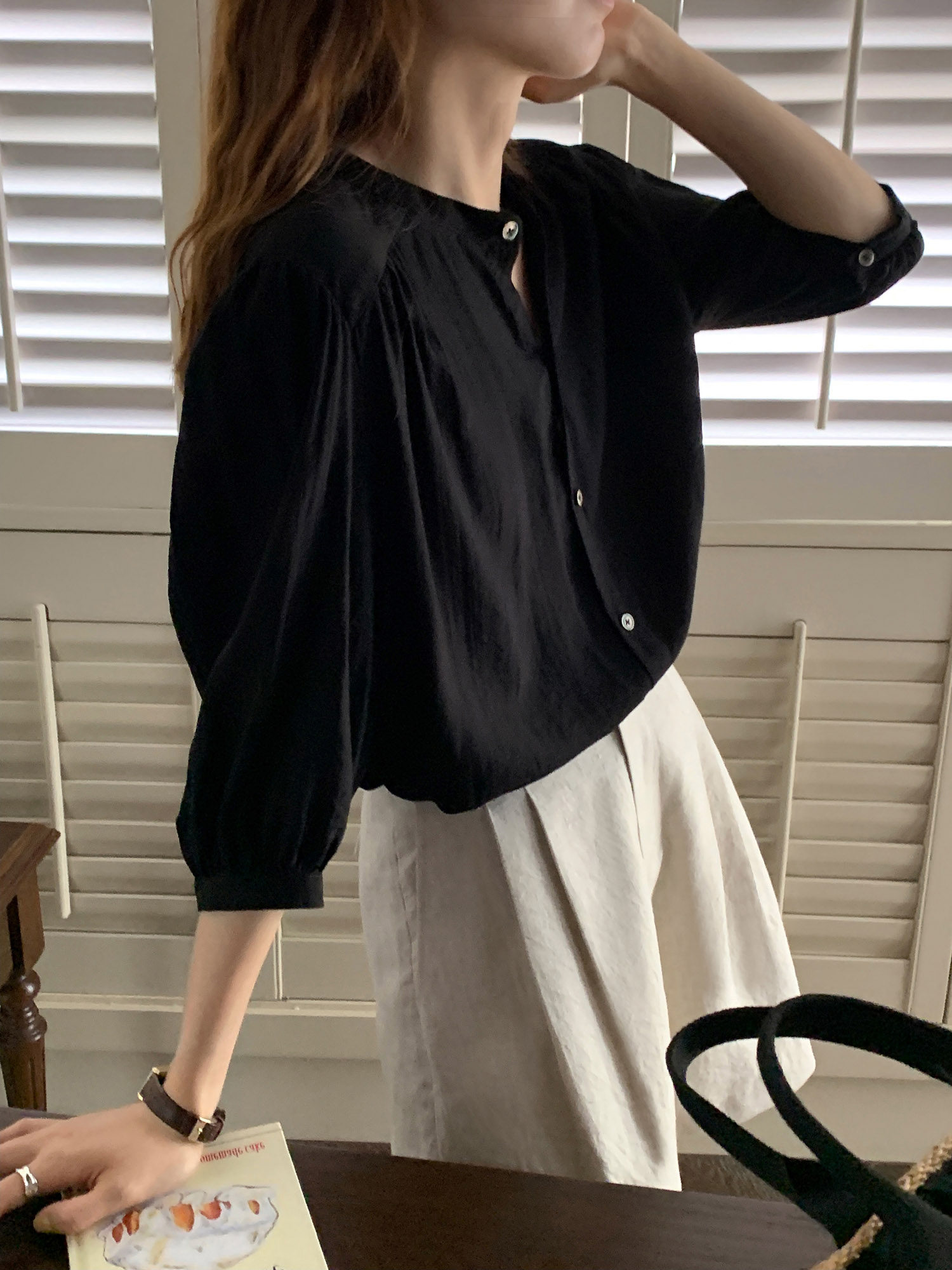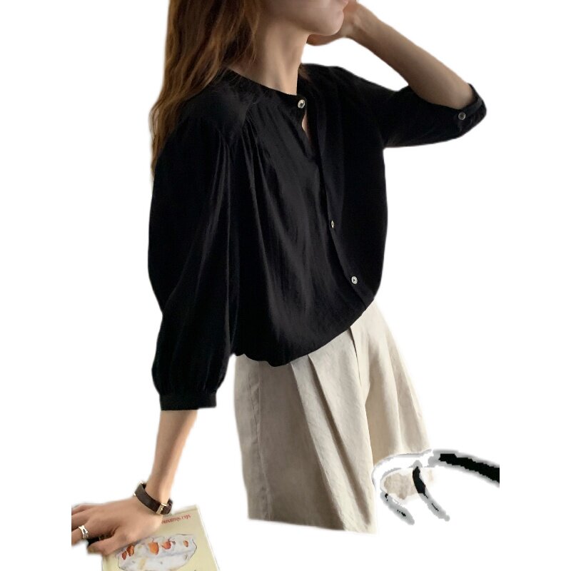 Черная тонкая рубашка с круглым воротником, французский стиль, рукава фонарики, защита от солнца