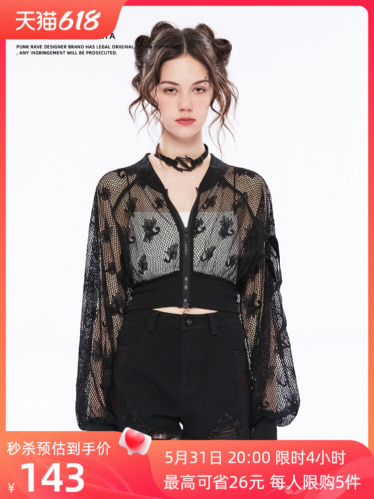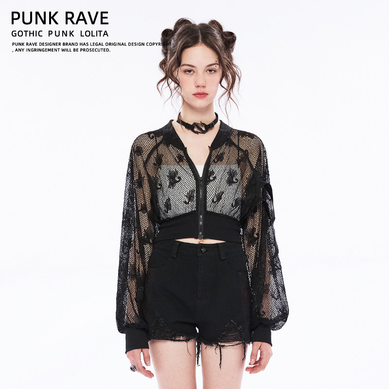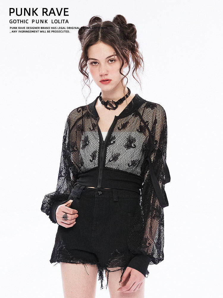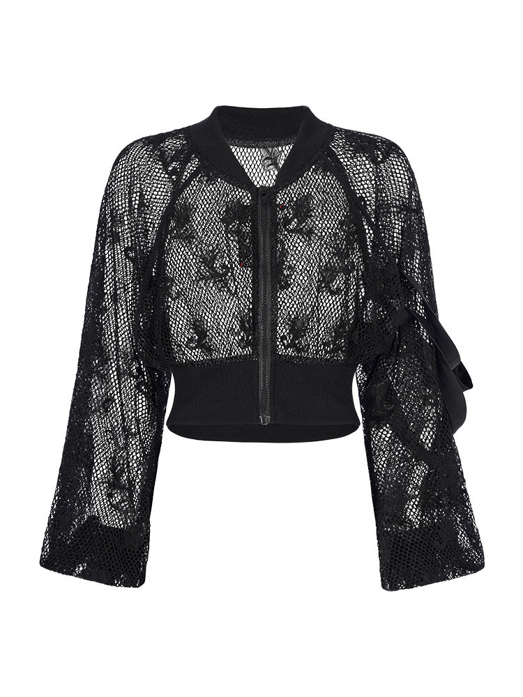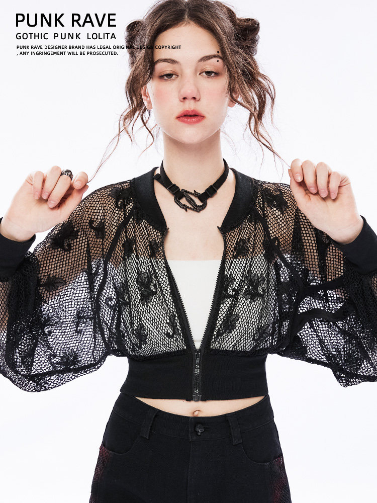 Черный короткий лонгслив, кружевная куртка, в стиле панк, свободный крой, защита от солнца